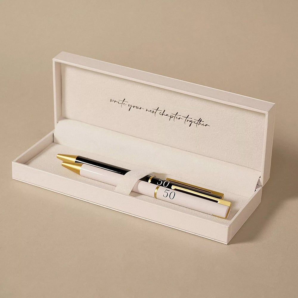 Celebrate a milestone of love with this elegant Amore by Juliana Set of 2 Pens. Marking a Golden Anniversary, the set includes one black pen and one white pen, each adorned with delicate gold detailing. Beautifully presented in a keepsake gift box inscribed with Golden Anniversary, 50 Years Together, this timeless set makes a thoughtful and meaningful gift for a special couple celebrating their enduring love.