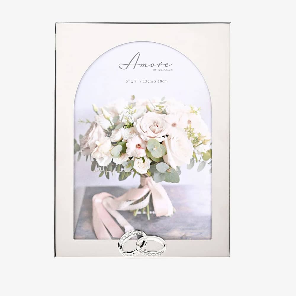 Beautifully designed with a graceful arched shape, this frame features a delicate wedding rings motif, perfect for showcasing a 5 x 7 inch photograph; it’s ideal for displaying a favourite wedding photo, engagement picture, or a special moment.