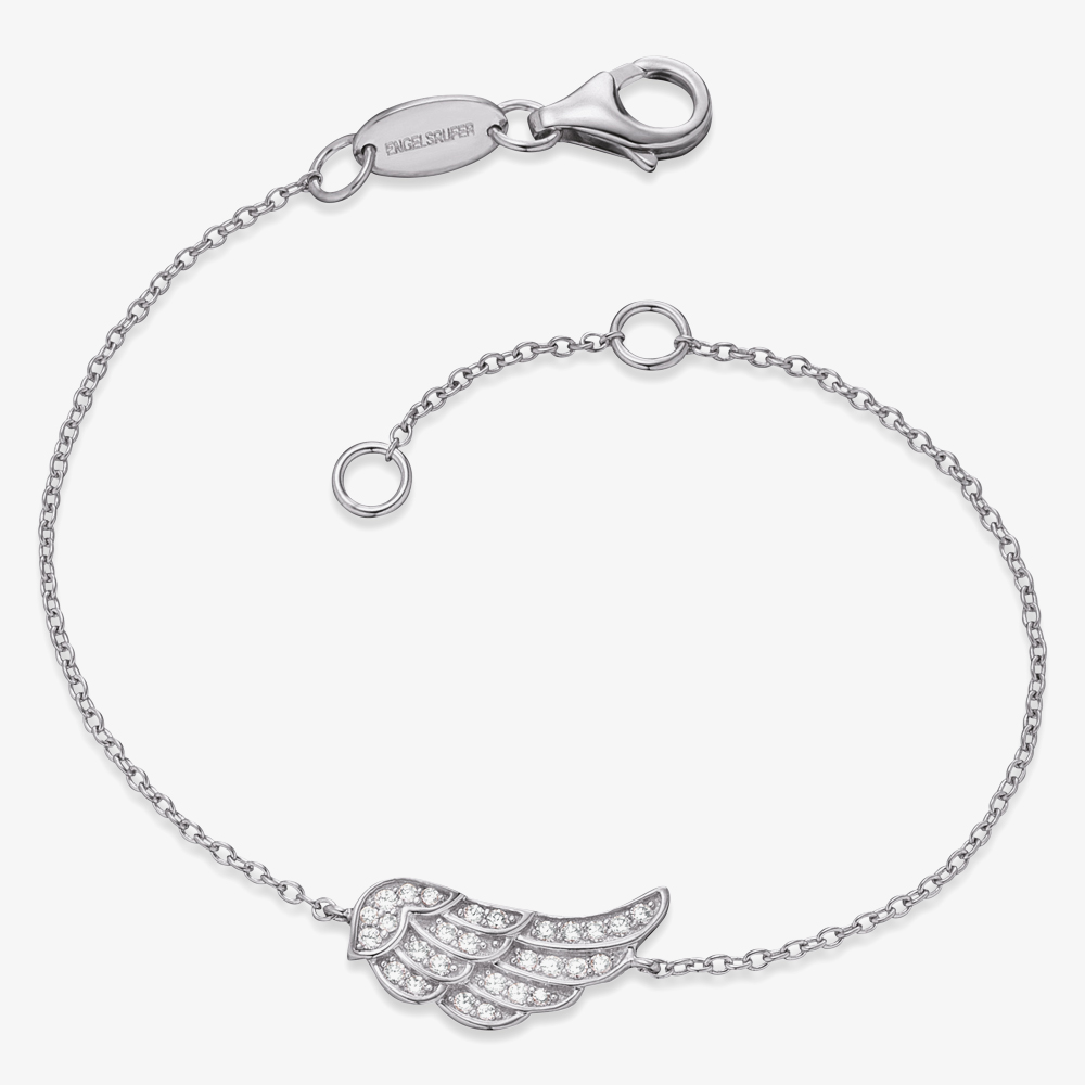 Angel Whisperer angel wing bracelet ERB-LILWING-ZI measures 17cm long and is made from rhodium plated sterling silver with 28 white synthetic cubic zirconia stones. The angel wing centrepiece measures 16.5mm and this bracelet also has a 2cm extender.