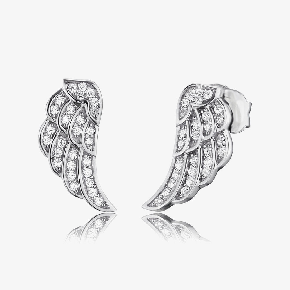 Angel Whisperer angel wing stud earrings ERE-LILWING-ZI-ST are made from rhodium plated sterling silver, measure 17.5mm, and are set with white synthetic cubic zirconia stones.