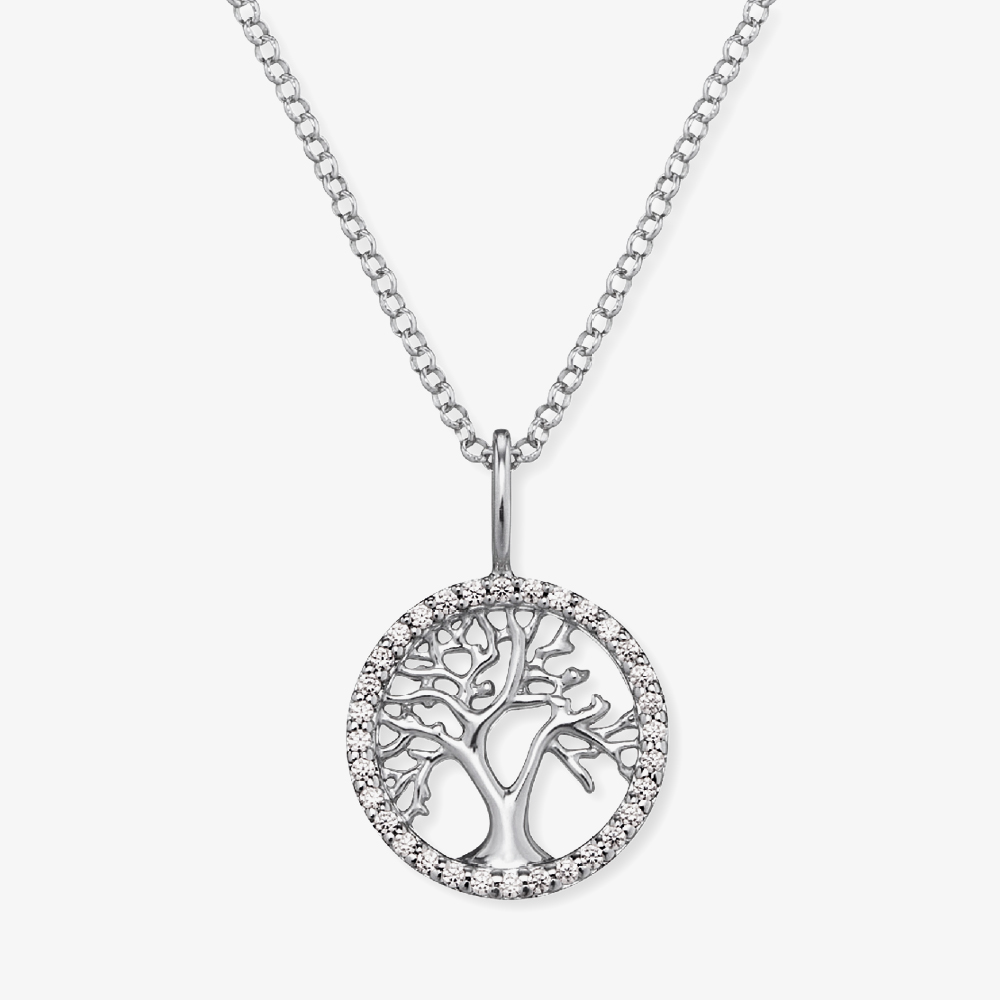 Angel Whisperer tree of life pendant necklace ERN-LILTREE-ZI is made from rhodium plated sterling silver and measures 40cm long with a 4cm extender. It has a 13.5mm pendant and is set with 32 white synthetic cubic zirconia stones.