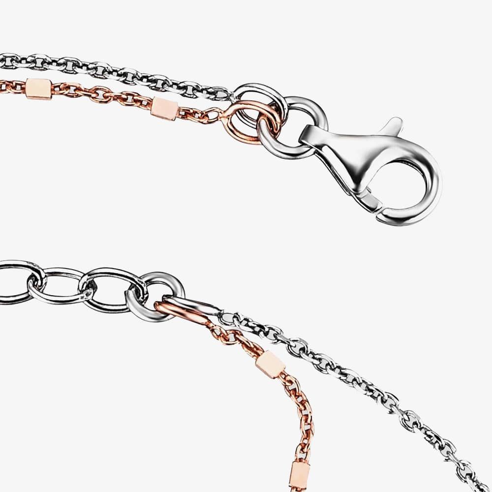 Angel Whisperer Twin Bicoloured Anklet ERF-LILTWIN-BICOR is delicately crafted from 925 sterling silver with rhodium plating and rose gold plating. This beautiful anklet features a silver belcher chain, with an additional rose gold-plated chain with rectangular detailing. The chain is adjustable in length, measuring 22-27cm in length with a thickness of 1.1mm. The combination of the two colours, rose gold and silver, stands for hope, purity and femininity.