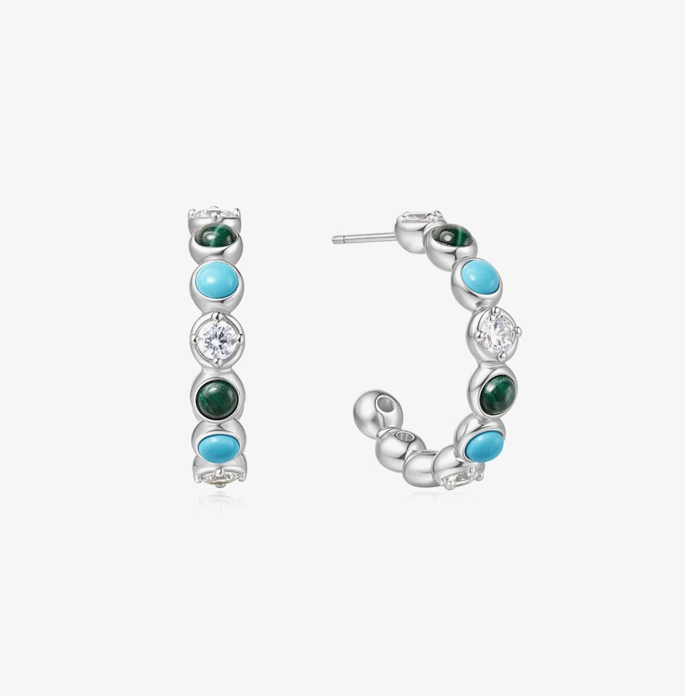 Brighten up your look with these elegant hoop earrings, crafted from rhodium-plated sterling silver. Featuring a striking mix of malachite, lab-created turquoise, and sparkling white cubic zirconia stones, they offer a perfect balance of vibrant colour and refined shine. Ideal for everyday wear or special occasions.