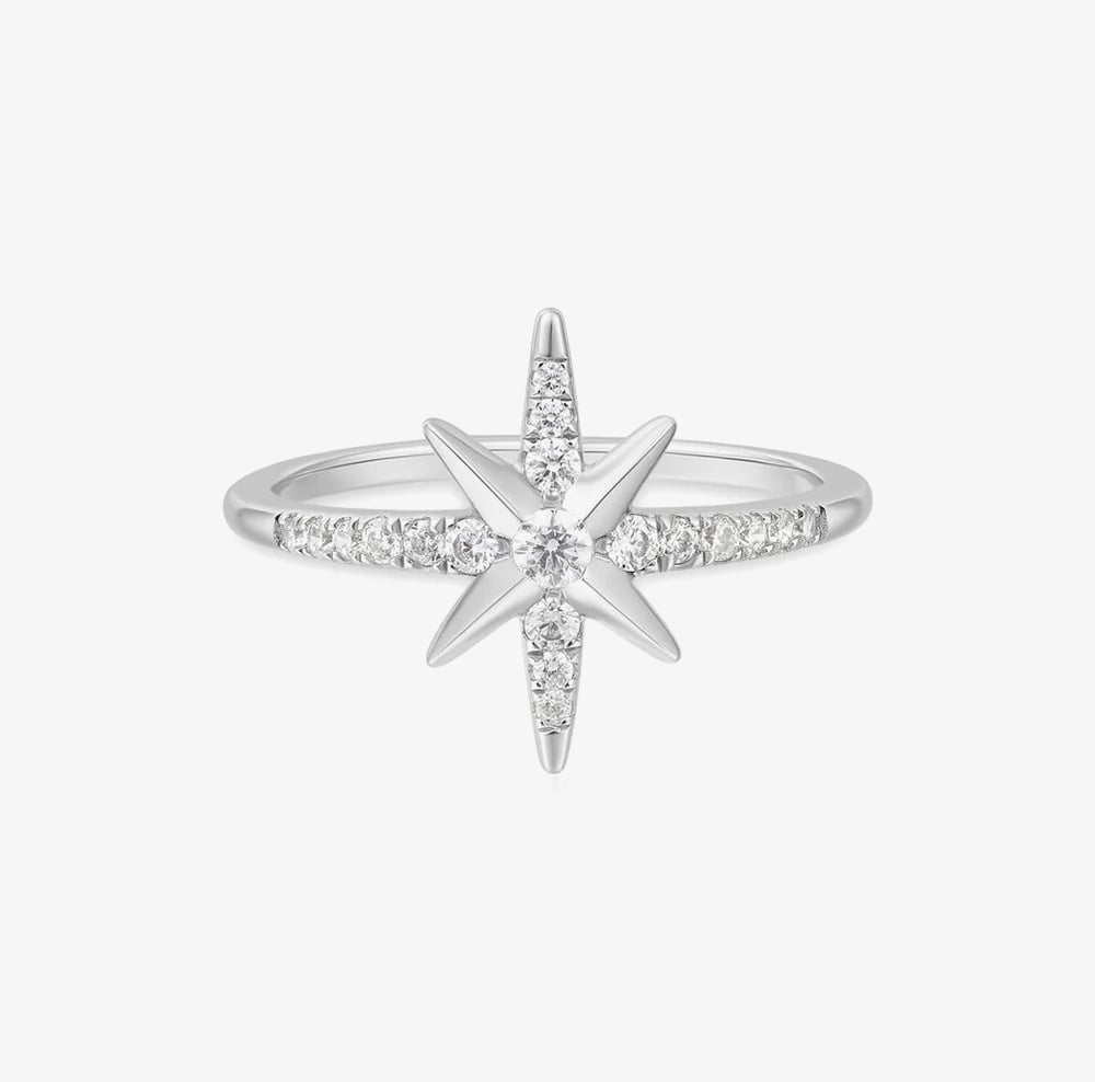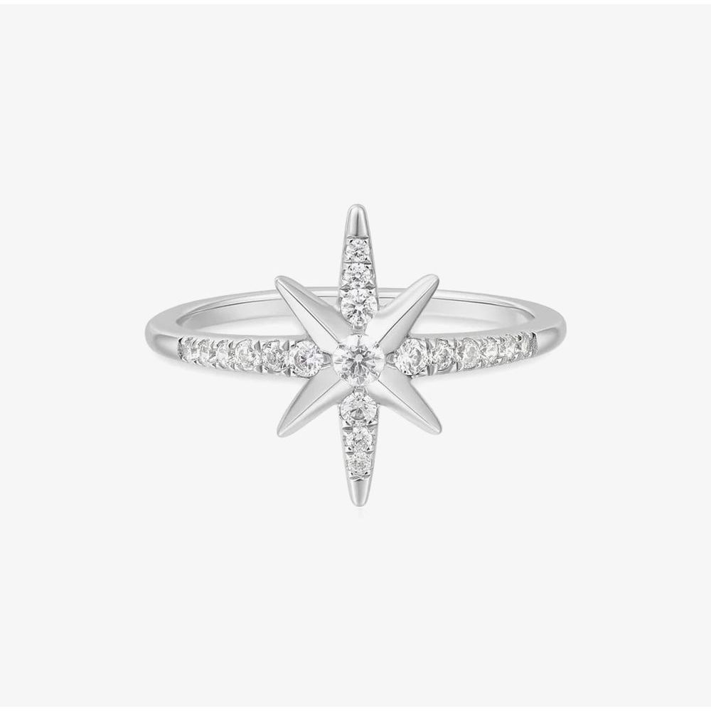 Radiate brilliance with this celestial-inspired signet ring, crafted from rhodium-plated sterling silver. The bold design features a refined eight-point star, accented with sparkling white cubic zirconia stones on both the star and the shoulders. A modern take on the classic signet ring, it adds a touch of starlit elegance to any outfit—perfect for everyday wear or as a striking statement piece.