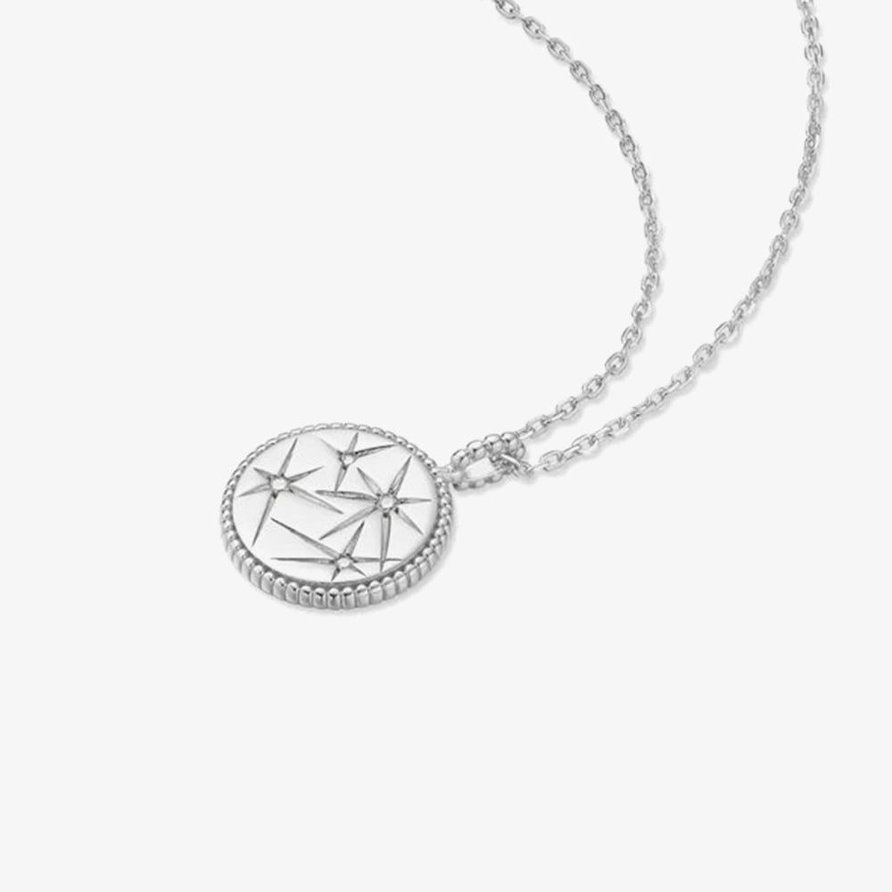 Charming and refined, the Miss Dainty Engraved Star Disc Necklace is made for the woman who embraces elegance with a whimsical twist. Crafted from 925 sterling silver with rhodium plating, it features a delicate disc pendant adorned with engraved stars and a subtle touch of cubic zirconia. Wear alone for a graceful statement or layered for a more personalized look.
