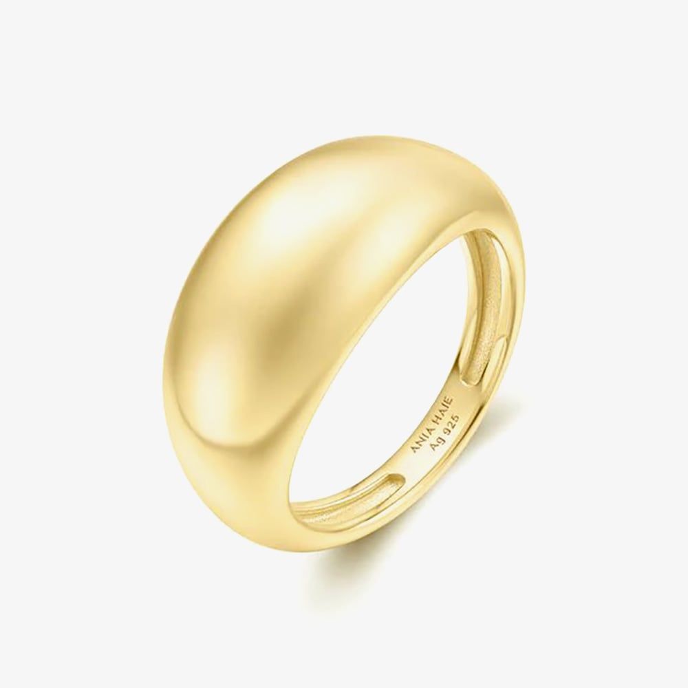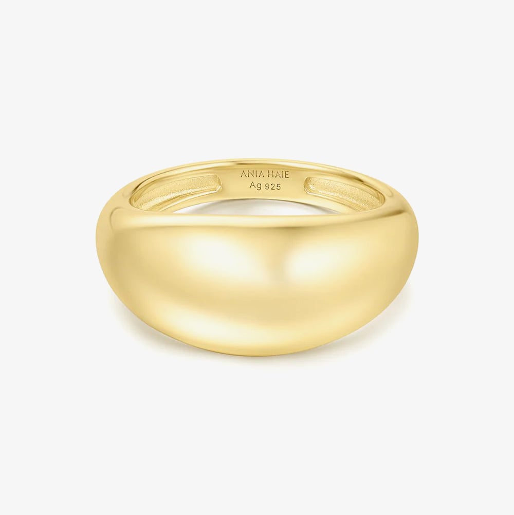 Make a statement with this bold dome ring, crafted from 14ct gold-plated sterling silver. With its smooth, sculptural surface and minimalist design, it delivers modern sophistication with an edge. Perfect worn solo for maximum impact or stacked with other rings for a layered look, this piece is a must-have for anyone who loves contemporary style with attitude.