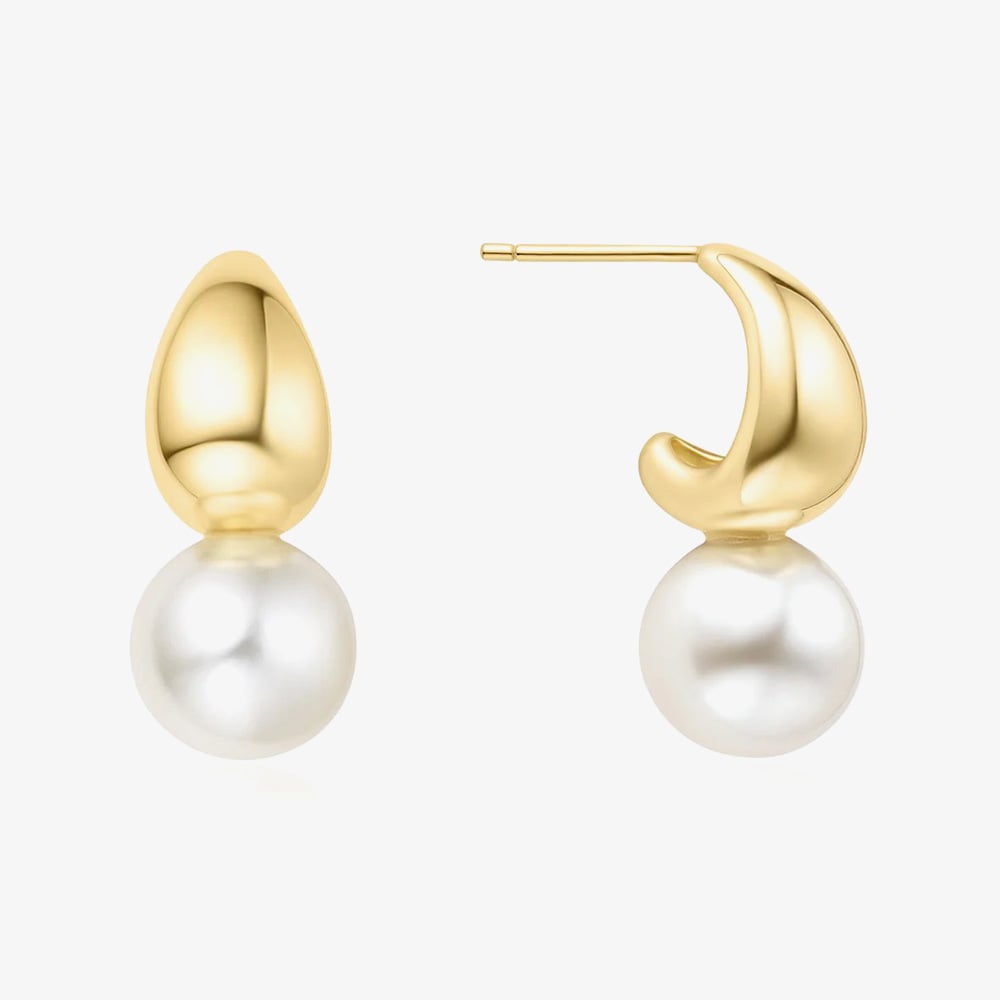 Elegant and refined, the Vogue Maven dome hoop earrings feature a shell pearl drop, combining bold minimalism with timeless style. Crafted from 925 sterling silver with 14ct gold plating, these earrings make a striking statement for any occasion. An ideal gift for those that love pearls or a great addition to your personal collection.
