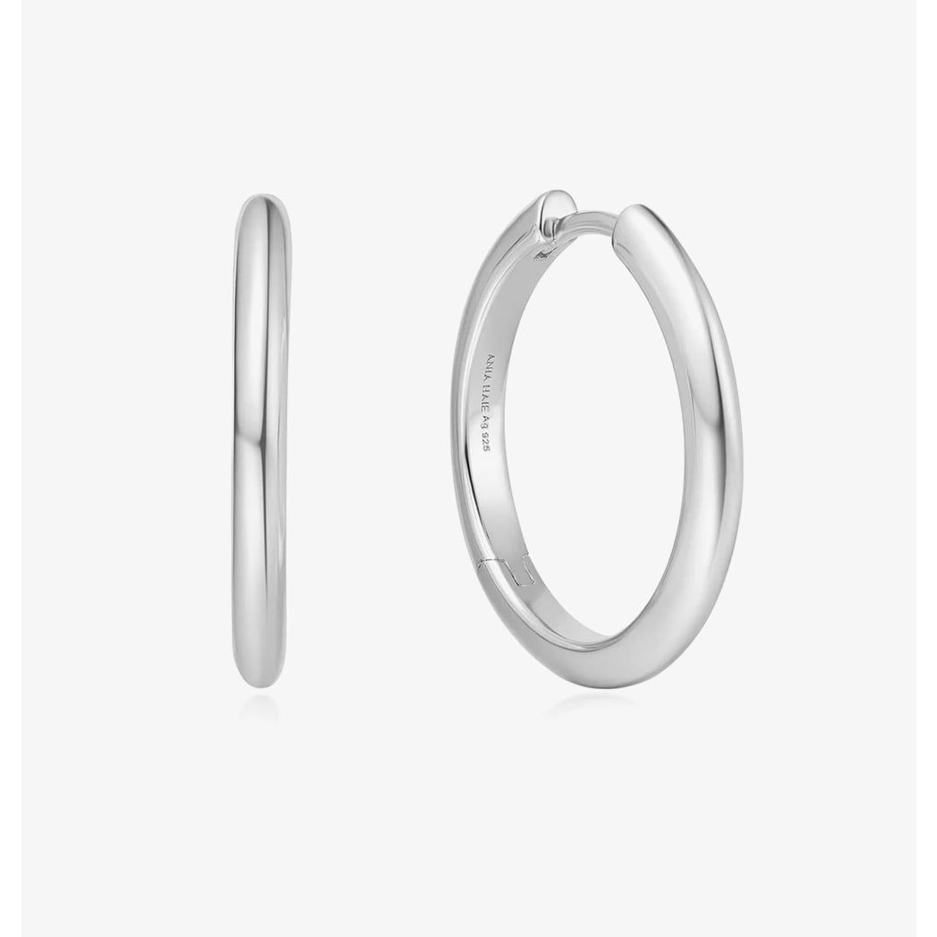 Timeless and sophisticated, these medium-sized hoop earrings are crafted from sterling silver and plated with rhodium for a sleek, polished finish. Their classic design makes them a versatile essential, perfect for everyday wear or elevating your evening look. Light yet striking, these hoops add a touch of refined elegance to any outfit.