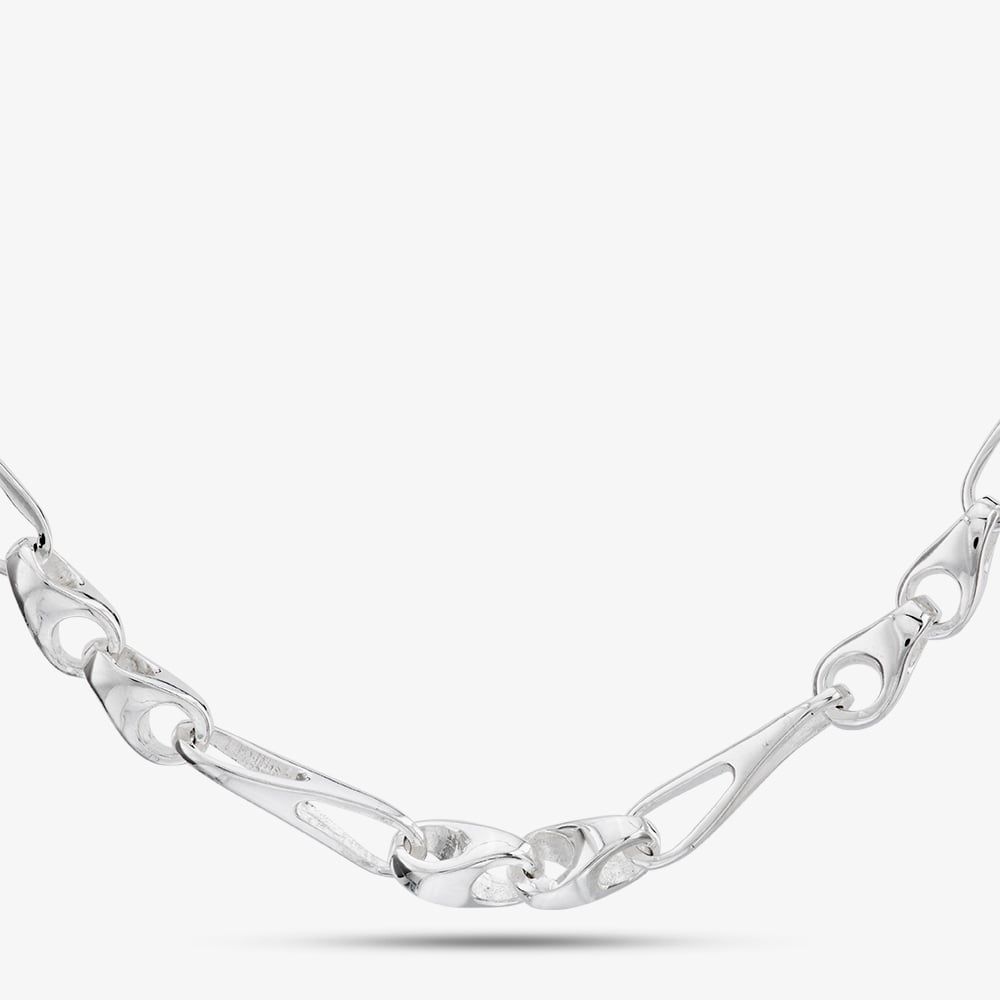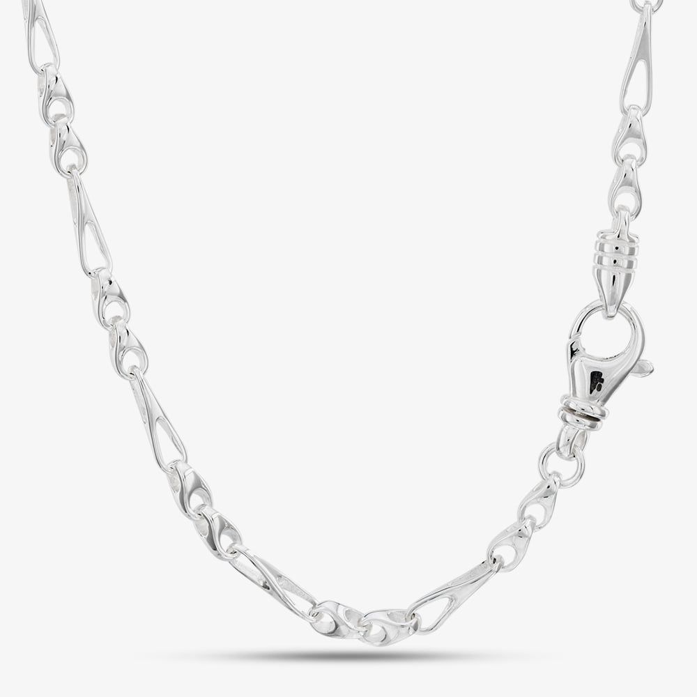 This 17.7-inch Argentium silver necklace showcases a refined fancy Figaro chain design with alternating links and a secure lobster clasp, offering timeless elegance and durability.