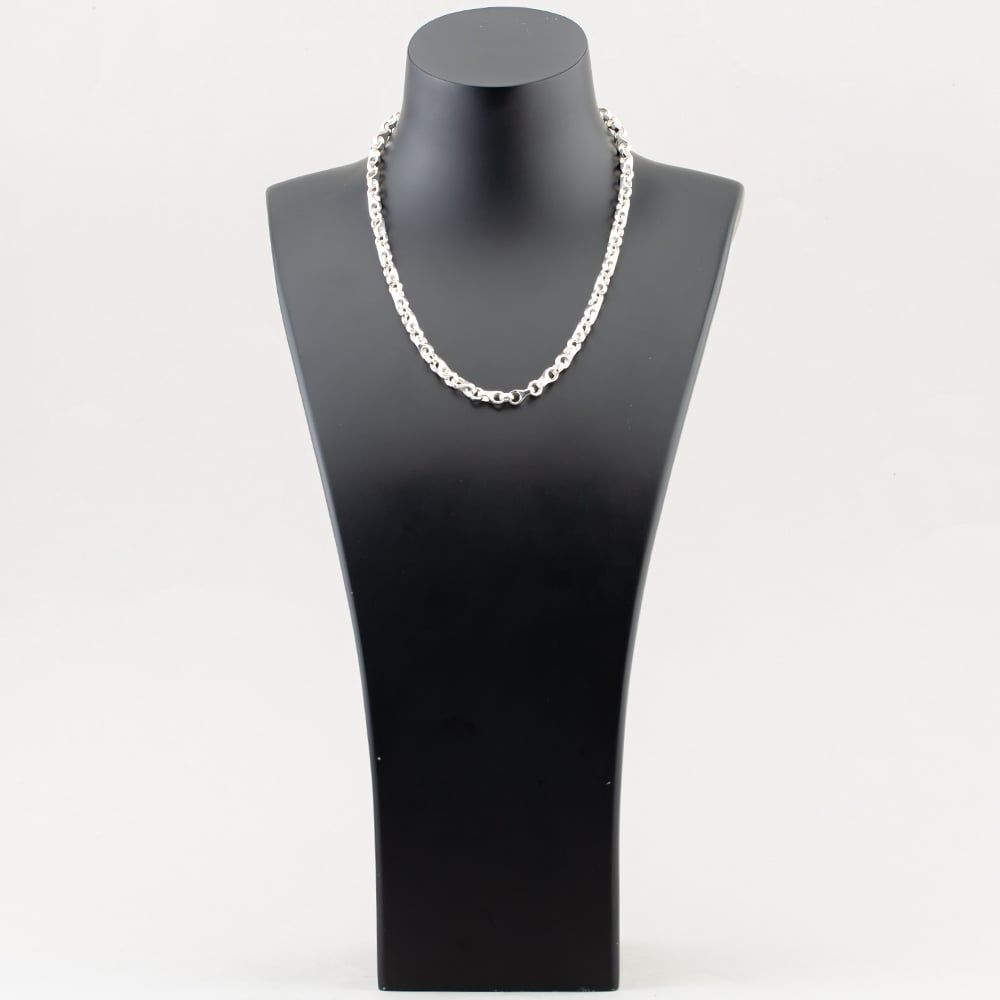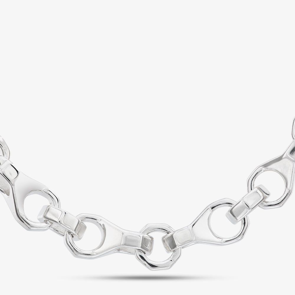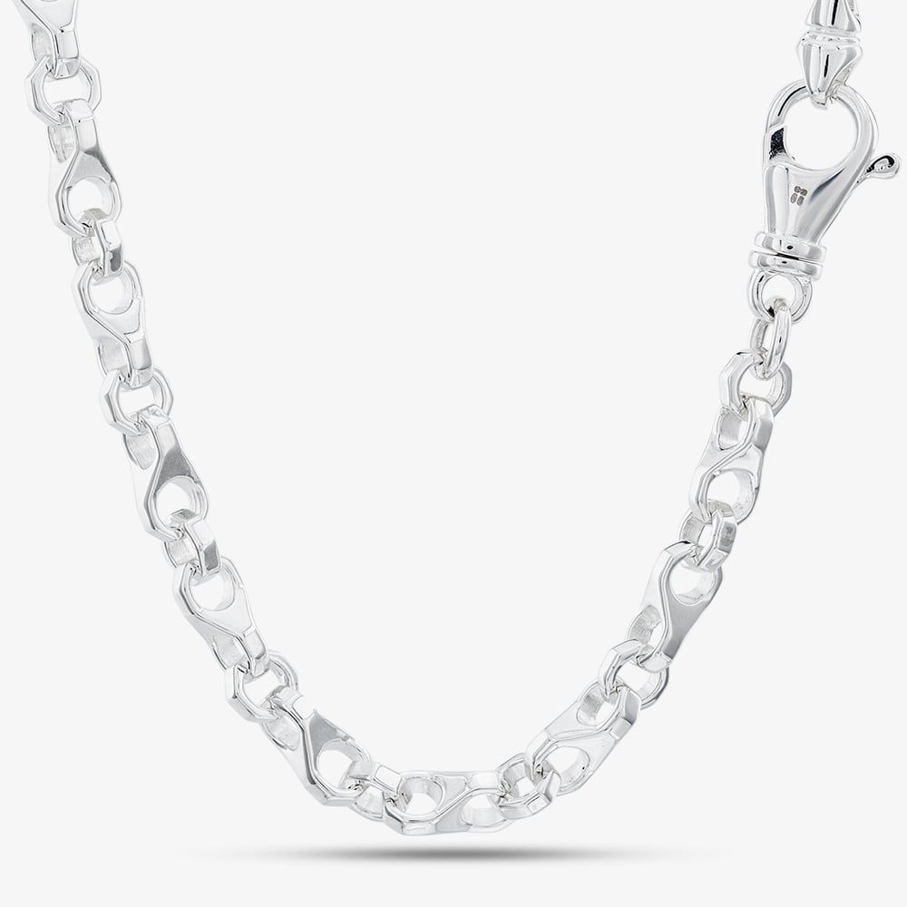 This 18-inch Argentium silver necklace features a bold bolt-style link chain, offering a modern and sleek design. It is secured with a sturdy lobster clasp, ensuring a secure fit and a stylish addition to any outfit.