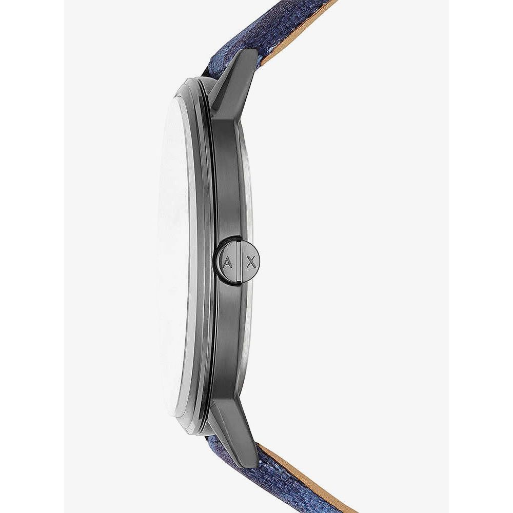 The Armani Exchange Cayde AX2750 watch combines a 42mm round shaped 50% recycled gunmetal finish stainless-steel case and blue pro-planet leather strap with a traditional buckle. It has a blue analogue dial with orange & gunmetal finish hands & hour markers which are protected beneath a mineral crystal glass. Power is generated by the quartz movement. This model also has a water resistance of up to 50 metres.