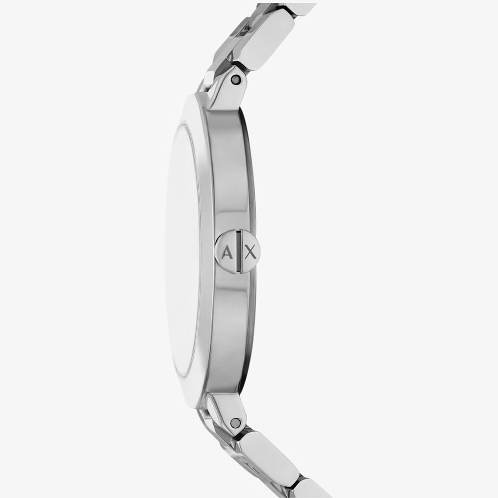 Combining elegance with contemporary style. This timepiece's sleek, silver-toned stainless steel case and bracelet exude sophistication, complemented by a minimalist dial featuring two hands for a clean, modern look. The subtle Armani Exchange logo at the 12 o'clock position adds a touch of luxury. This timepiece is not just a watch but a statement piece, perfect for those who appreciate refined design.