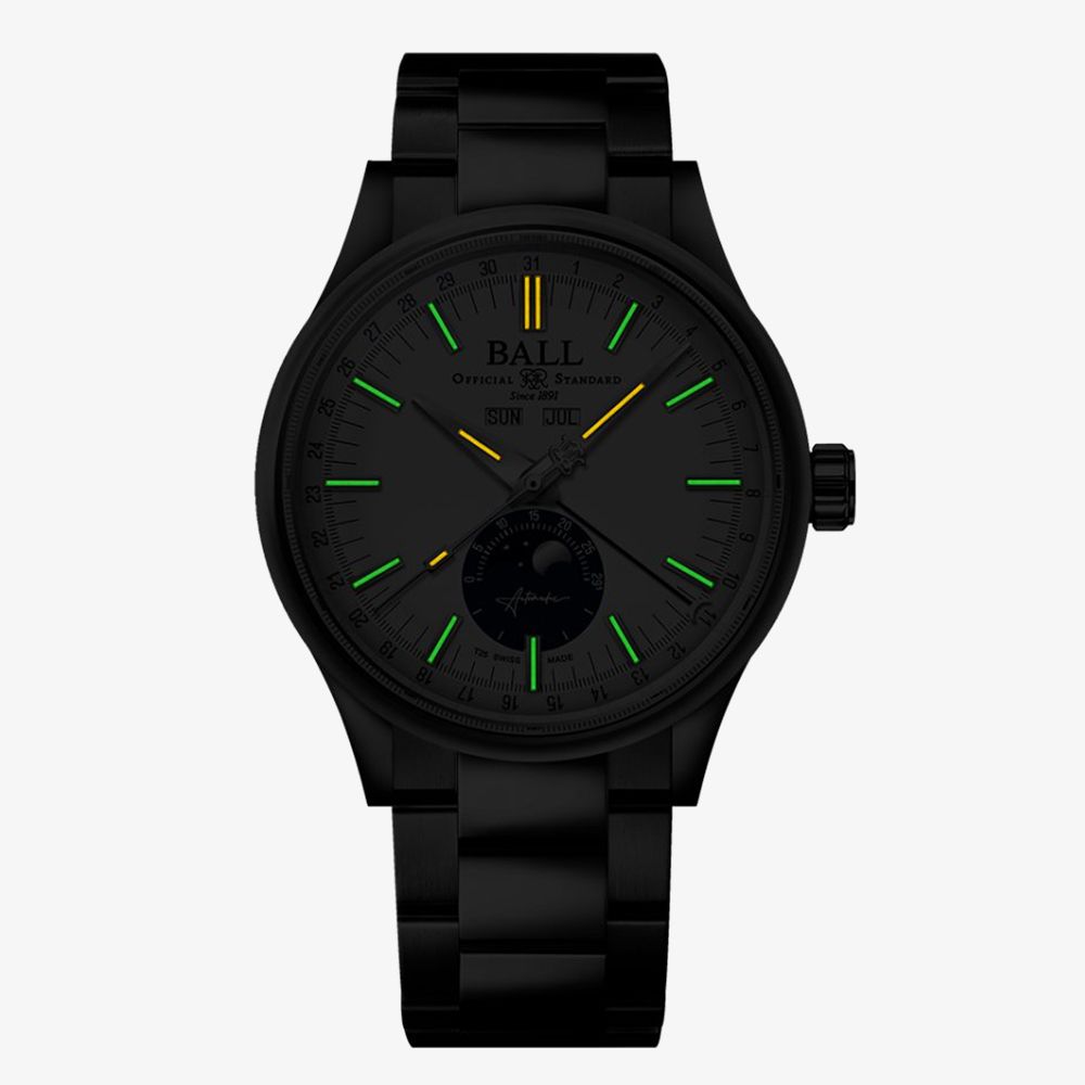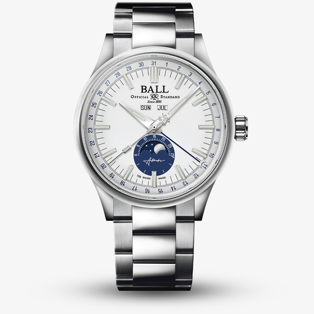 This Limited Edition marvel, with only 1,000 pieces available, exemplifies Ball’s heritage of precision and innovation. The watch is housed in a stainless-steel case with a striking white dial. Driven by the automatic calibre BALL RR1807, it offers comprehensive functionality with moon phase, month, day, and date indications, alongside hours, minutes, and sweep seconds. With 16 microgas tubes ensuring superior night visibility, this timepiece is as reliable as it is refined, even in the most adverse conditions.