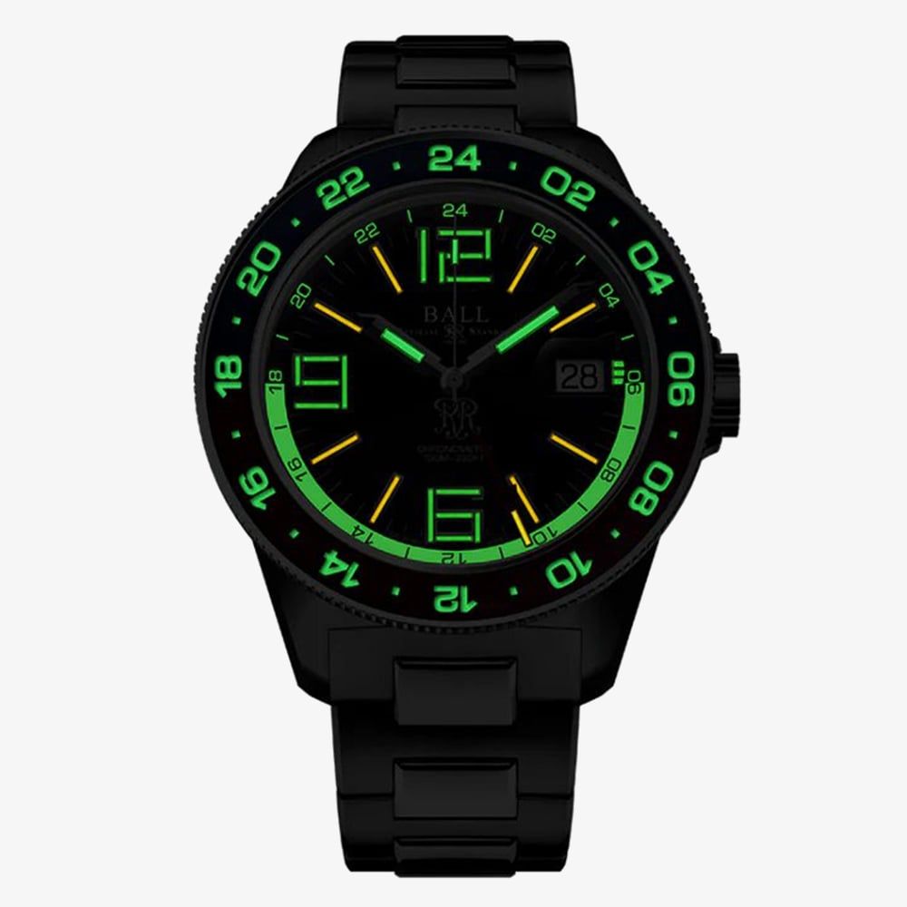The Ball Engineer III Maverick GMT is a robust men's watch designed for both precision and style. It features a sleek black dial with luminescent hands and markers, offering excellent readability in low light. The GMT function allows tracking of a second time zone, ideal for travellers. Housed in a durable stainless steel case, this watch is water-resistant up to 100 meters and equipped with an anti-magnetic and shock-resistant design, ensuring reliable performance in various environments.