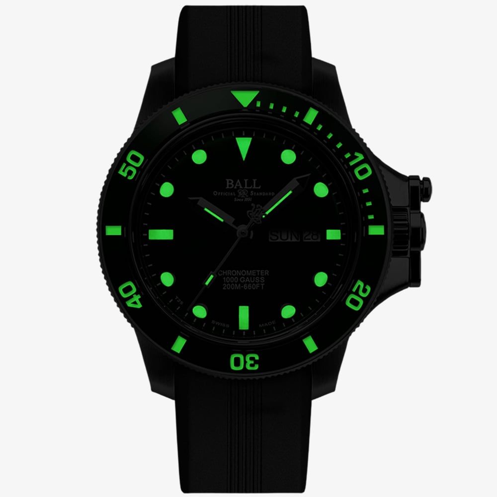 This timepiece reflects BALL’s relentless pursuit of precision and durability. The watch features a robust 43mm stainless steel case paired with a commanding green dial, offering a striking and modern look. Luminous micro gas tubes on the hands and markers ensure unmatched visibility in total darkness—no charging or external light source required. The rubber strap enhances comfort and flexibility, making it perfect for both outdoor and everyday wear. With a day/date display and durable sapphire crystal glass for protection, this watch blends practical features with tactical aesthetics.
