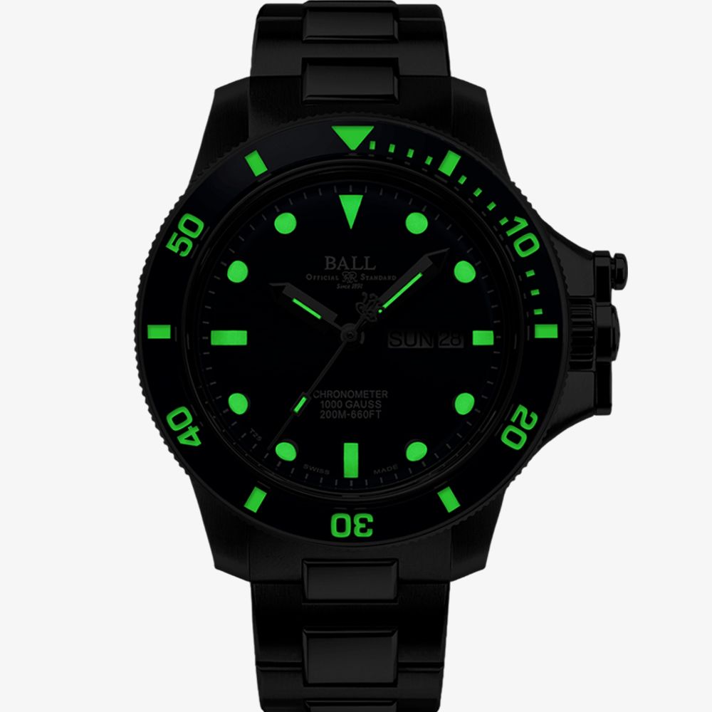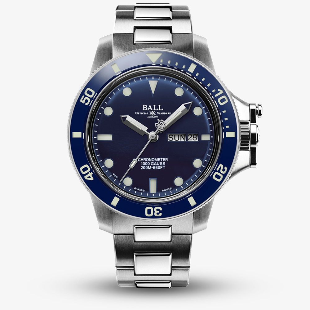 With its striking blue dial and high-performance features, this timepiece is a true testament to BALL’s uncompromising engineering heritage. Housed in a solid 43mm stainless steel case, the watch is equipped with BALL’s signature patented crown protection system, ensuring durability and security during extreme conditions. Its ceramic rotating bezel adds both a functional and aesthetic edge, being highly resistant to scratches and fading.