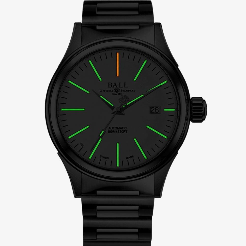 A sleek and reliable timepiece, featuring a crisp white dial within a polished stainless steel case, offering a clean and modern aesthetic. The classic design is enhanced by Ball's micro gas tube technology on the hands and markers, providing unmatched visibility in low-light conditions. Powered by a dependable automatic movement with a power reserve of up to 38 hours, this watch ensures accurate timekeeping for daily wear. The stainless steel bracelet adds durability and a refined touch, while its robust construction includes 100m water resistance, shock resistance, and anti-magnetic protection, making it suitable for both casual and formal occasions.