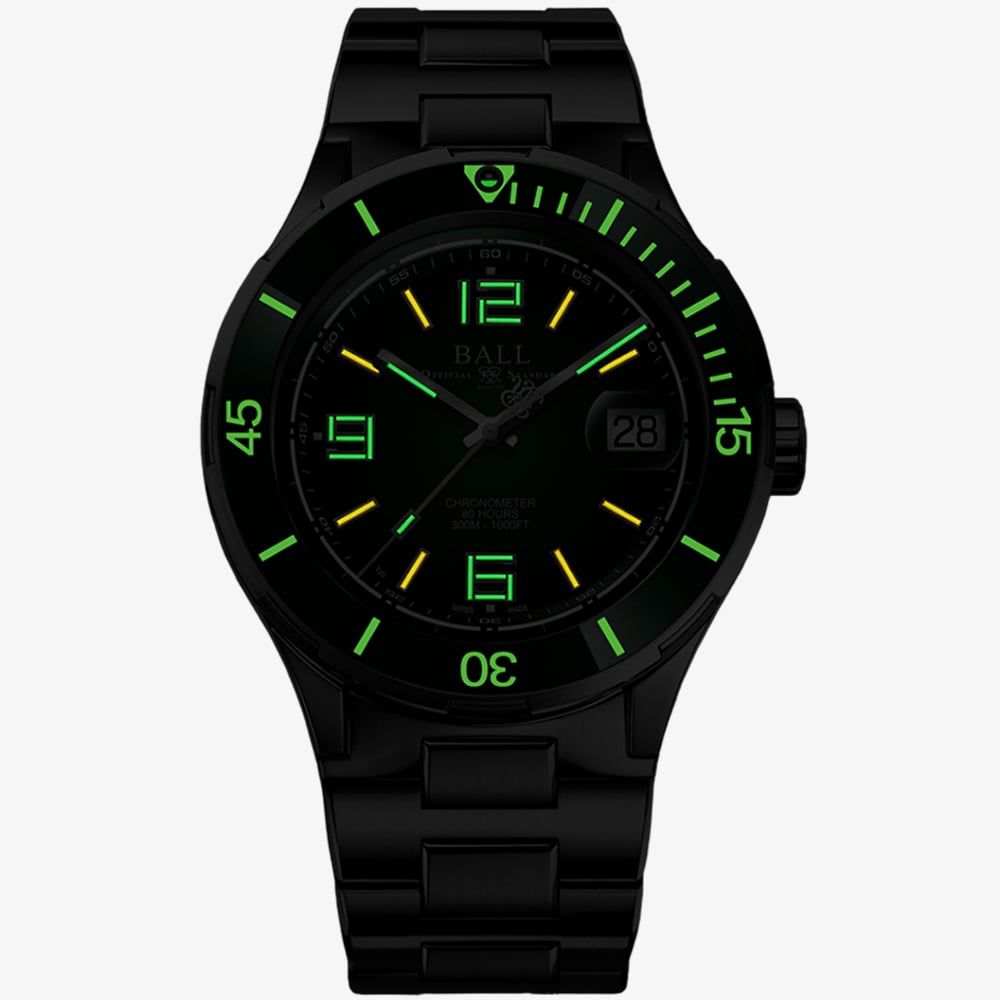 A limited edition watch engineered for those who live life on the edge. This model showcases BALL’s signature precision and toughness, wrapped in a striking, aviation-inspired design. At its core is a bold green dial. The 42mm stainless steel case is rugged yet refined, complemented by a matching steel bracelet for maximum durability and comfort. Thanks to self-powered micro gas tubes, the dial delivers unmatched night-time readability, glowing brightly without needing a charge or light source. Water-resistant up to 100 metres and equipped with a day/date complication, this watch is ready for any challenge—on land, in the air, or at sea.