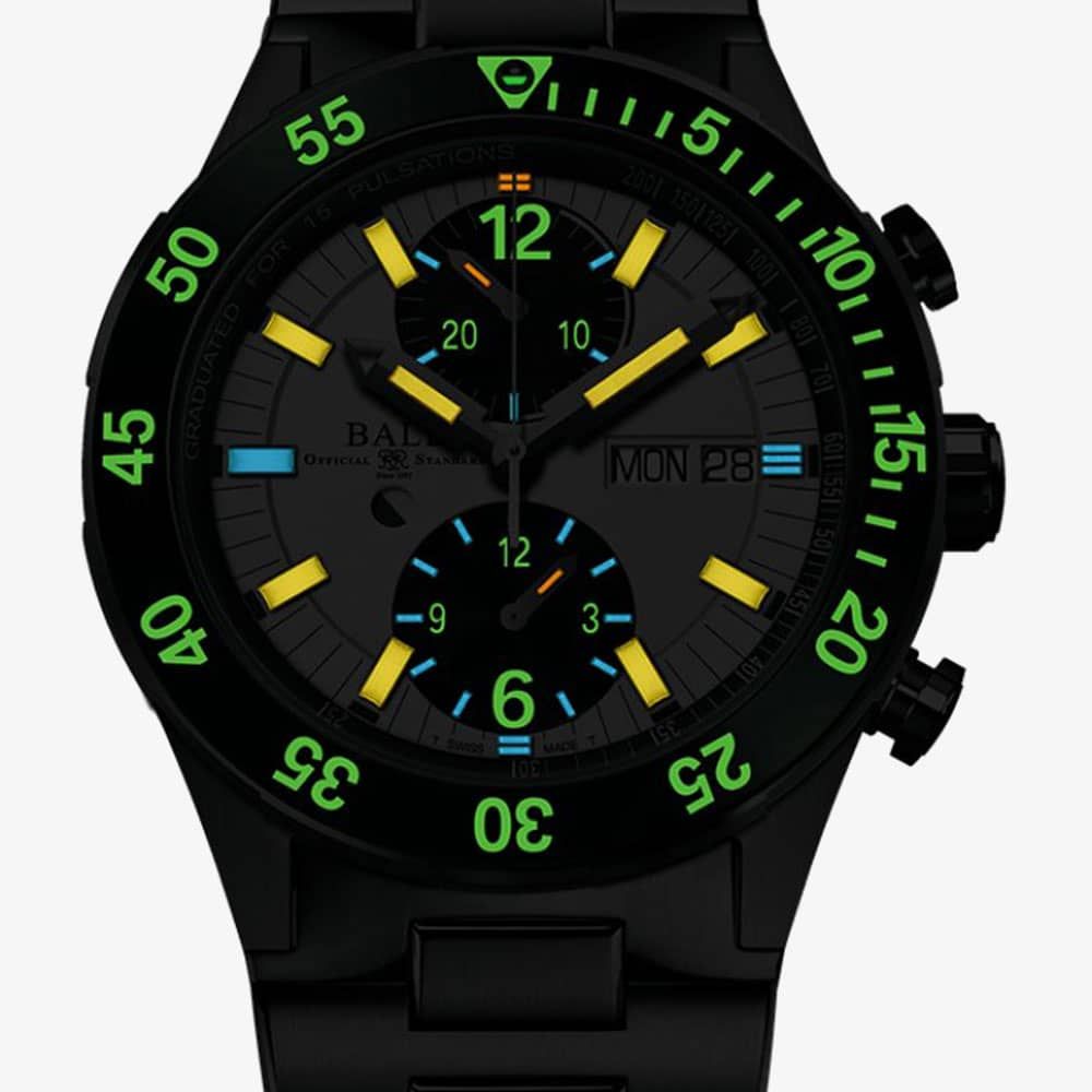 This stunning limited-edition automatic Roadmaster Rescue Chronograph features a white dial with racing green accents on the bezel and dials, limited to 1000 pieces. The chronograph offers an accumulated measurement of up to 12 hours and houses the renowned automatic Ball caliber movement. Aesthetically, this timepiece is remarkable, boasting a tapered titanium and stainless-steel bracelet. It also includes a unidirectional rotating stainless-steel bezel with a ceramic insert and gas tube illumination.