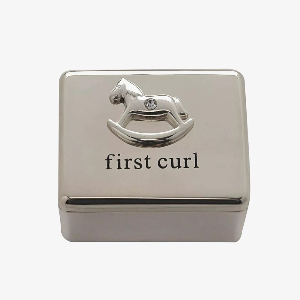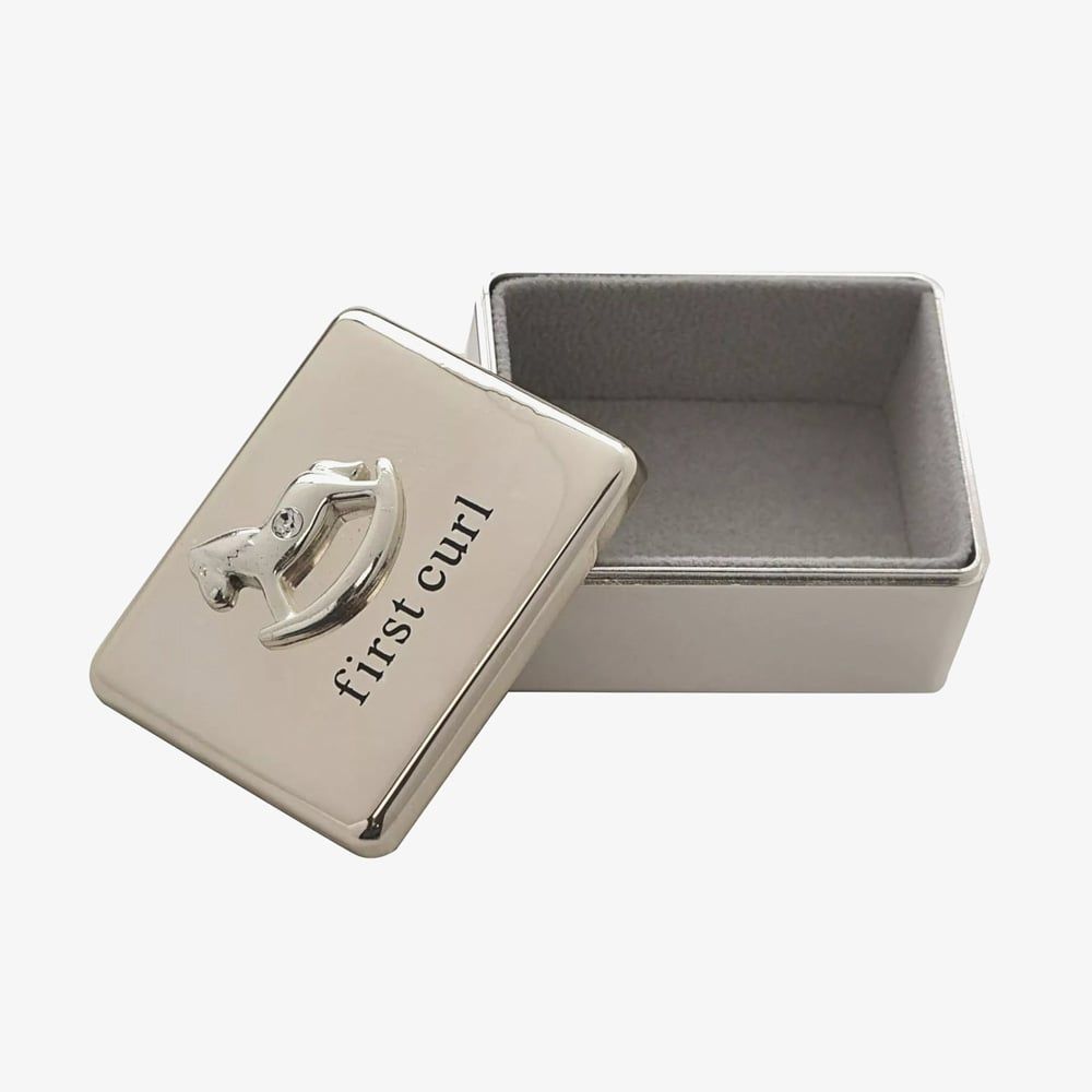 This silver-plated first curl box from BAMBINO BY JULIANA is a beautifully crafted keepsake designed to preserve a cherished memento. Featuring a smooth finish with an engraved "First Curl" inscription and a crystal-set rocking horse icon on the lid, it offers a timeless way for parents to treasure their little one's first curl. The interior is lined with grey velveteen for added elegance.