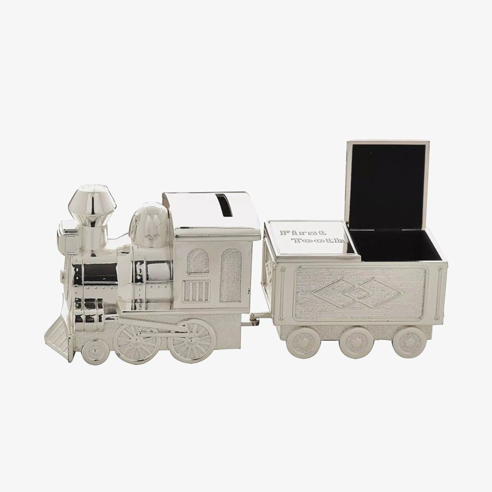 This delightful train money box with a first tooth and curl carriage from BAMBINO BY JULIANA is a beautiful keepsake for any nursery. Crafted with real silver plating and featuring smooth and textured finishes, it captures the charm of locomotives. The train includes a large money slot, while the carriage has two hinged lids for storing a ‘first tooth’ and ‘first curl,’ each with matching engravings.