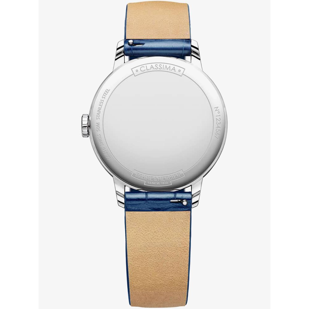 https://www.thbaker.co.uk/baume-mercier-ladies-classima-watch-10329103961Baume & Mercier Ladies Classima Watch 10329https://www.thbaker.co.uk/media/catalog/product/2/4/24-09-009_grey.jpg14401730GBPOutOfStockCLASSIMA SS BLU SW WHT DI The Baume & Mercier 10329 Classima watch combines a 31mm round shaped stainless steel case and glossy blue alligator leather strap with a buckle clasp. It has a silver sun satin-finished dial with 8 diamond hour markers totalling 0.03ct, a moonphase indicator, and a date display, all of which is protected beneath scratch resistant sapphire crystal glass. Power is generated by the Swiss made Ronda 788 quartz movement. This model also has a water resistance of up to 50 metres.Baume & Mercierhttps://www.thbaker.co.uk/media/catalog/product/2/4/24-09-009_02_grey.jpghttps://www.thbaker.co.uk/media/catalog/product/2/4/24-09-009_06_grey.jpghttps://www.thbaker.co.uk/media/catalog/product/2/4/24-09-009_05_grey.jpghttps://www.thbaker.co.uk/media/catalog/product/2/4/24-09-009_04_grey.jpghttps://www.thbaker.co.uk/media/catalog/product/2/4/24-09-009_03_grey.jpghttps://www.thbaker.co.uk/media/catalog/product/b/a/baume-and-mercier-packaging_grey.jpg7613268785171add-to-cartcondition:Nodisc_no_stock:Yesex_display:NoNoYesNo2409009Baume & Mercier10329LadiesOfficial Baume & Mercier Packaging2 Year Baume & Mercier WarrantyLuxuryNoClassimaWatchBlueLeather StrapStainless SteelRound7.0mm31mmAnalogueSapphire Crystal GlassSilver50 metresQuartzPin BuckleDiamondNoNoNoNoYesNoNoBaume & Mercier Ladies Classima Watch24-09-0092021-04-21 00:00:00[]2021-04-21