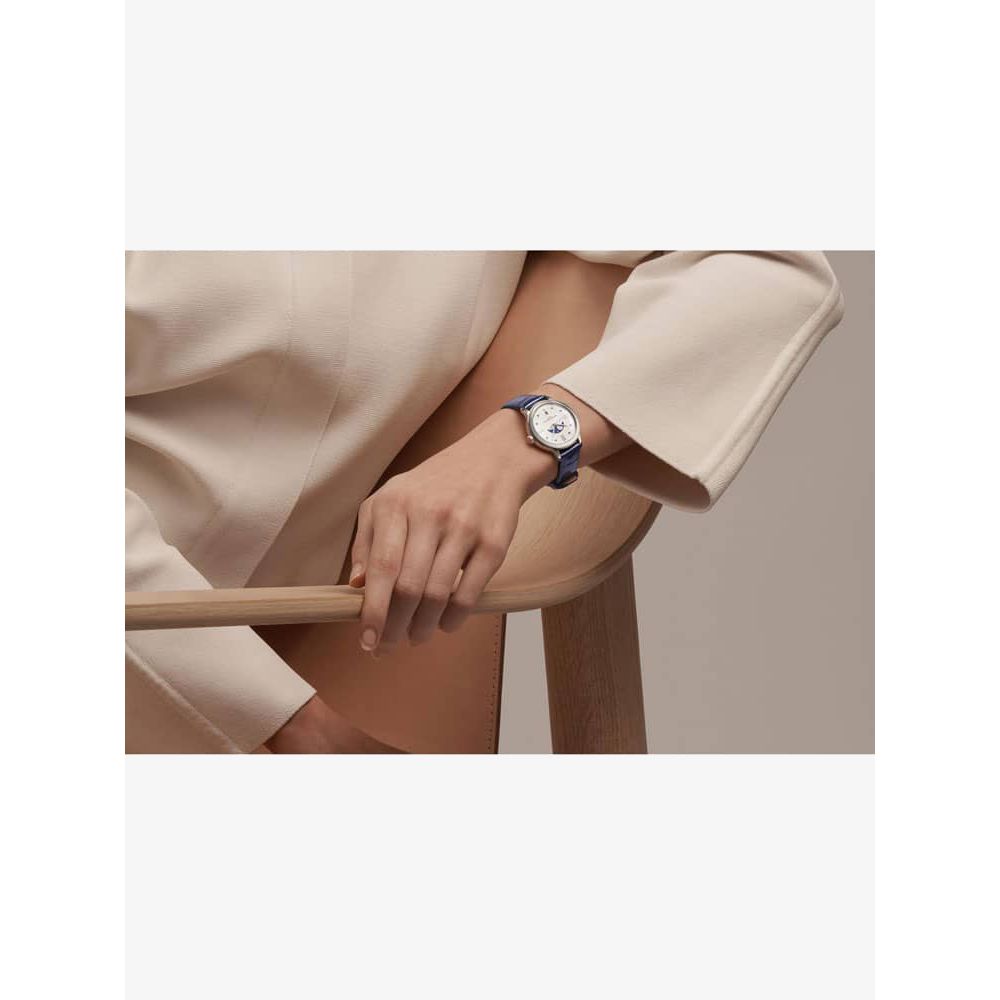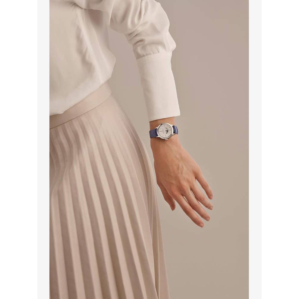 The Baume & Mercier 10329 Classima watch combines a 31mm round shaped stainless steel case and glossy blue alligator leather strap with a buckle clasp. It has a silver sun satin-finished dial with 8 diamond hour markers totalling 0.03ct, a moonphase indicator, and a date display, all of which is protected beneath scratch resistant sapphire crystal glass. Power is generated by the Swiss made Ronda 788 quartz movement. This model also has a water resistance of up to 50 metres.