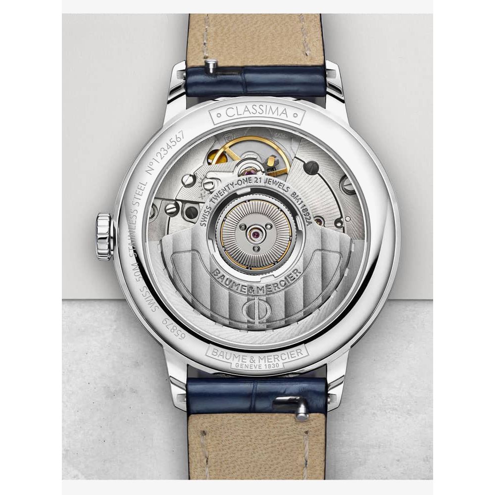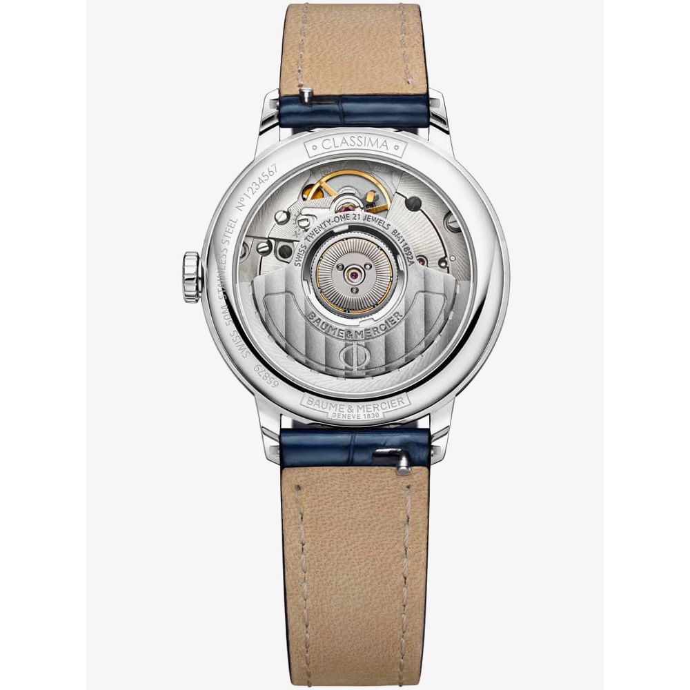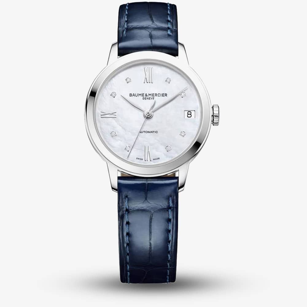 https://www.thbaker.co.uk/baume-mercier-ladies-classima-watch-10545103969Baume & Mercier Ladies Classima Watch 10545https://www.thbaker.co.uk/media/catalog/product/2/4/24-09-017_grey.jpg18402600GBPOutOfStockCLASSIMA SS BLU SW MOP DI The Baume & Mercier 10545 Classima watch combines a 31mm round shaped stainless steel case and blue leather strap with a buckle clasp. It has a mother of pearl analogue dial with a date display and 8 diamond hour markers totalling 0.03ct, all of which is protected beneath scratch resistant sapphire crystal glass. Power is generated by the Swiss made ETA 2892-A2 automatic movement with 21 rubies and 42 hour power reserve. This model also has a sapphire crystal case back and a water resistance of up to 50 metres.Baume & Mercierhttps://www.thbaker.co.uk/media/catalog/product/2/4/24-09-017_03_grey.jpghttps://www.thbaker.co.uk/media/catalog/product/2/4/24-09-017_02_grey.jpghttps://www.thbaker.co.uk/media/catalog/product/b/a/baume-and-mercier-packaging_grey.jpg7613375404040add-to-cartcondition:Nodisc_no_stock:Yesex_display:NoNoYesNo2409017Baume & Mercier10545LadiesOfficial Baume & Mercier Packaging2 Year Baume & Mercier WarrantyLuxuryNoClassimaWatchBlueLeather StrapStainless SteelRound8.0mm31mmAnalogueSapphire Crystal GlassMother of Pearl50 metresAutomaticPin BuckleDiamondNoNoNoNoYesNoNoBaume & Mercier Ladies Classima Watch24-09-0172021-04-21 00:00:00[]2021-04-21