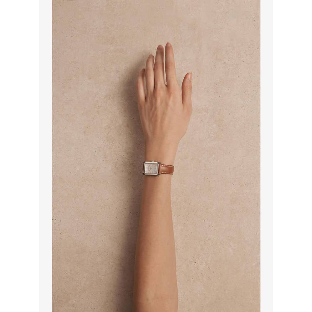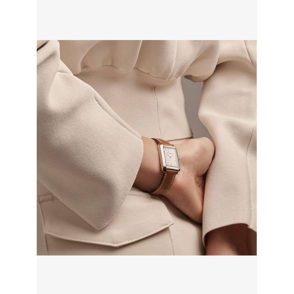The Baume & Mercier 10472 Hampton watch combines a rectangular shaped stainless steel case and light brown leather strap with a buckle clasp. The case measures 22mm wide by 35mm long. It has a silver dial with gold tone hands and hour markers which is protected beneath curved scratch resistant sapphire crystal glass. Power is generated by the Swiss made MHH057 quartz movement. This model also has a water resistance of up to 50 metres.