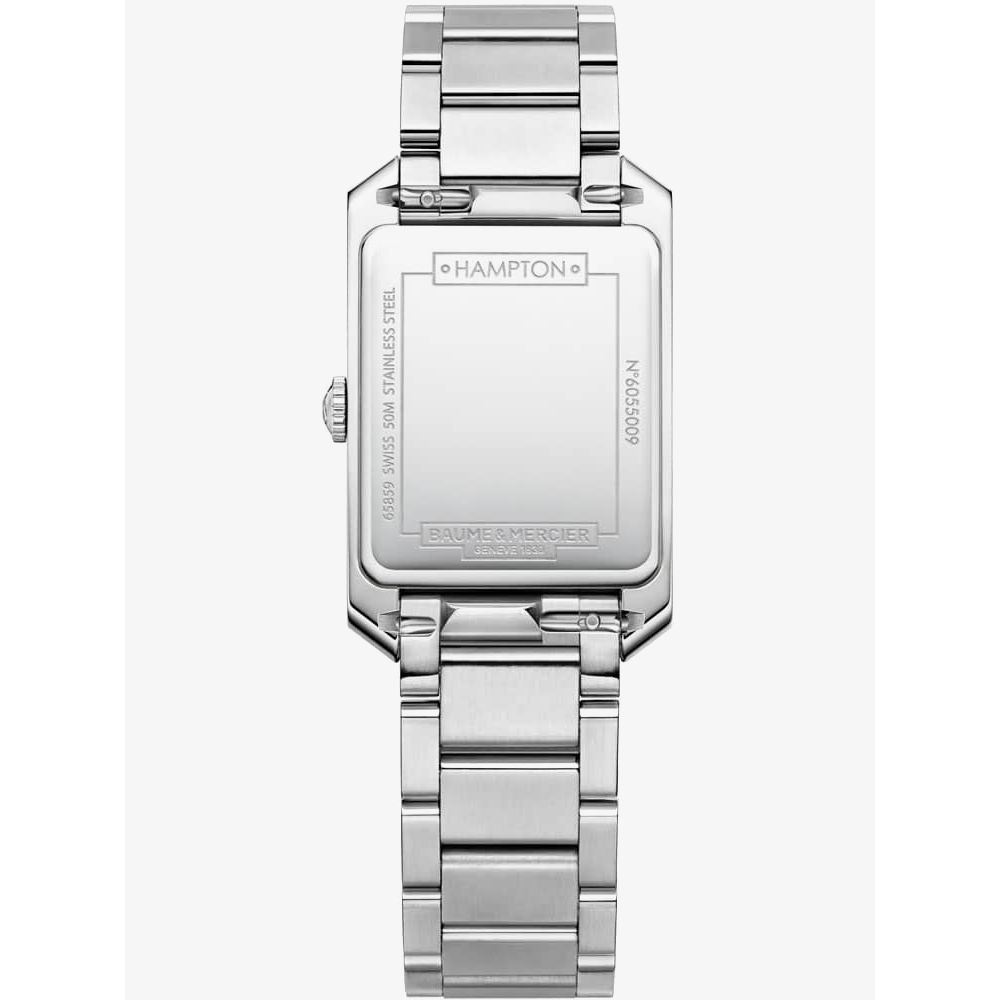 The Baume & Mercier 10474 Hampton watch combines a rectangular shaped stainless steel case and bracelet with a fold over clasp. The case measures 22mm wide by 35mm long. It has a mother of pearl analogue dial with silver tone hands and four diamonds totalling 0.02ct, all of which is protected beneath curved scratch resistant sapphire crystal glass. Power is generated by the Swiss made MHH057 quartz movement. This model also has a water resistance of up to 50 metres.