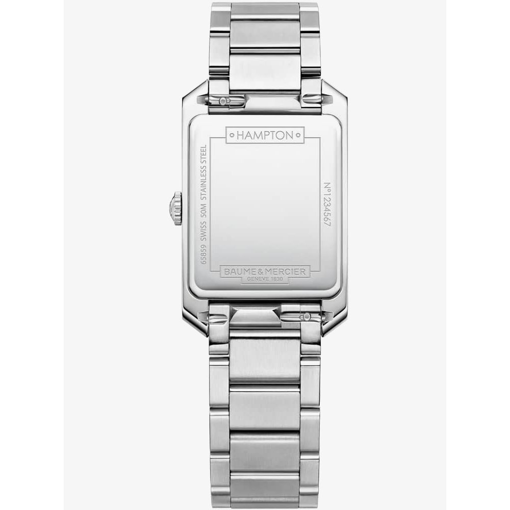 The Baume & Mercier 10476 Hampton watch combines a rectangular shaped stainless steel case and bracelet with a fold over clasp. The case measures 22mm wide by 35mm long. It has a blue analogue dial with silver tone hands and hour markers, all of which is protected beneath curved scratch resistant sapphire crystal glass. Power is generated by the Swiss made MHH057 quartz movement. This model also has a water resistance of up to 50 metres.Baume & Mercierhttps://www.thbaker.co.uk/media/catalog/product/2/4/24-09-014_03_grey.jpghttps://www.thbaker.co.uk/media/catalog/product/2/4/24-09-014_02_grey.jpghttps://www.thbaker.co.uk/media/catalog/product/2/4/24-09-014_06_grey.jpghttps://www.thbaker.co.uk/media/catalog/product/2/4/24-09-014_05_grey.jpghttps://www.thbaker.co.uk/media/catalog/product/2/4/24-09-014_04_grey.jpghttps://www.thbaker.co.uk/media/catalog/product/b/a/baume-and-mercier-packaging_grey.jpg7613375150220condition:Nodisc_no_stock:Yesex_display:NoNoYesNo2409014Baume & Mercier10476LadiesOfficial Baume & Mercier Packaging2 Year Baume & Mercier WarrantyLuxuryNoHamptonWatchSilverStainless Steel BraceletStainless SteelRectangle7.0mm22mmAnalogueSapphire Crystal GlassBlue50 metresQuartzFold Over ClaspNo StoneNoNoNoNoNoNoNoEx-Display Baume & Mercier Ladies Hampton Watch24-09-0142021-04-21 00:00:000[]2021-04-21