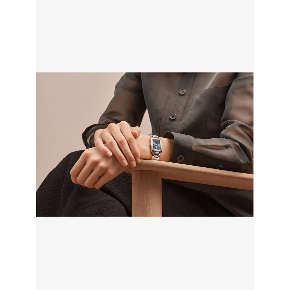 The Baume & Mercier 10476 Hampton watch combines a rectangular shaped stainless steel case and bracelet with a fold over clasp. The case measures 22mm wide by 35mm long. It has a blue analogue dial with silver tone hands and hour markers, all of which is protected beneath curved scratch resistant sapphire crystal glass. Power is generated by the Swiss made MHH057 quartz movement. This model also has a water resistance of up to 50 metres.