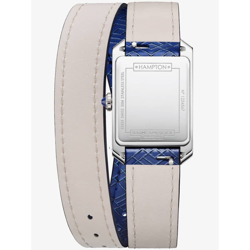 The Baume & Mercier 10629 Hampton watch combines a 35mm rectangular shaped stainless steel case and blue double wrap calfskin leather strap with a traditional buckle. It has a white analogue dial with silver hands and markers which is protected beneath curved scratch resistant sapphire crystal glass. Power is generated by the Swiss made MHH057 quartz movement. This model also has a water resistance of up to 50 metres.Baume & Mercierhttps://www.thbaker.co.uk/media/catalog/product/2/4/24-09-035_baumemercier_02.jpghttps://www.thbaker.co.uk/media/catalog/product/2/4/24-09-035_baumemercier_03.jpghttps://www.thbaker.co.uk/media/catalog/product/2/4/24-09-035_baumemercier_04.jpghttps://www.thbaker.co.uk/media/catalog/product/b/a/baume-and-mercier-packaging_5.jpg7613375590415add-to-cartcondition:Nodisc_no_stock:Yesex_display:NoNoYesNo2409035Baume & Mercier10629LadiesOfficial Baume & Mercier Packaging2 Year Baume & Mercier WarrantyLuxuryNoHamptonWatchBlueLeather StrapStainless SteelRectangle7.0mm35mmAnalogueSapphire Crystal GlassWhite50 metresQuartzPin BuckleNo StoneNoNoNoNoNoNoNoEx-Display Baume & Mercier Ladies Hampton Watch24-09-0352021-10-13 00:00:000[]2021-10-13