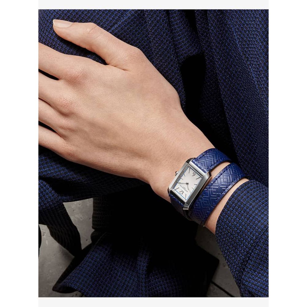 The Baume & Mercier 10629 Hampton watch combines a 35mm rectangular shaped stainless steel case and blue double wrap calfskin leather strap with a traditional buckle. It has a white analogue dial with silver hands and markers which is protected beneath curved scratch resistant sapphire crystal glass. Power is generated by the Swiss made MHH057 quartz movement. This model also has a water resistance of up to 50 metres.