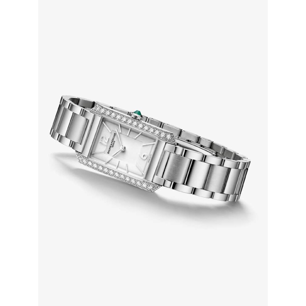 The Baume & Mercier 10631 Hampton watch combines a 35mm rectangular shaped stainless steel case and bracelet with a fold over clasp. It has a silver analogue dial which is protected beneath scratch resistant sapphire crystal glass. Power is generated by the Swiss made MHH057 quartz movement. This model also has a water resistance of up to 50 metres, a diamond set bezel with 0.35ct in total, and a green chrysoprase stone set into the crown symbolizing new beginnings and known for fostering sweetness, good intuition and luck.