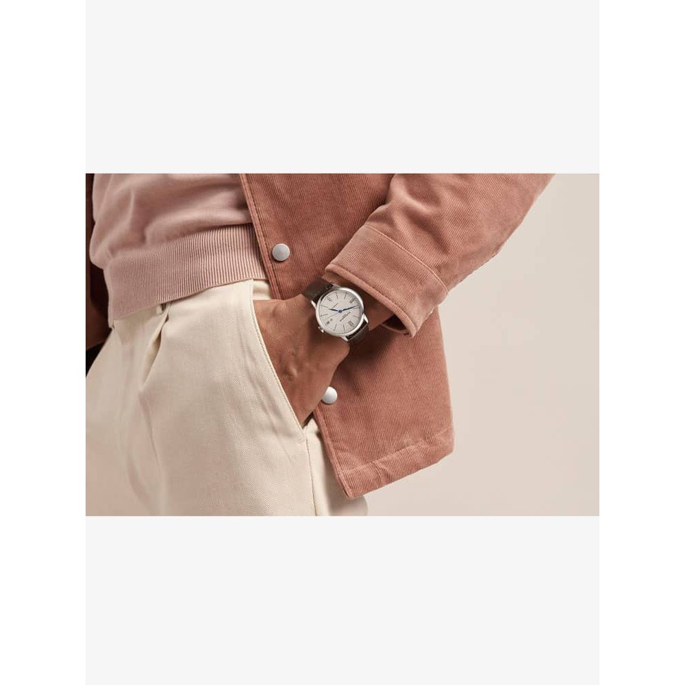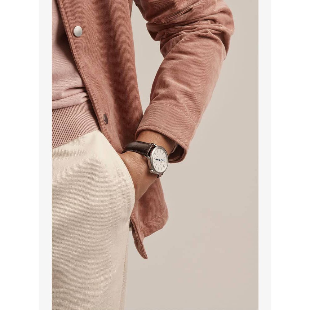 The Baume & Mercier 10214 Classima watch combines a 40mm round shaped stainless steel case and brown leather strap with a triple folding clasp and push button. It has a white analogue dial with blue hands and a date display which is protected beneath scratch resistant sapphire crystal glass. Power is generated by the Swiss made Sellita SW200 automatic movement with 26 Rubies and a 38 hour power reserve. This model also has a sapphire crystal case back and a water resistance of up to 50 metres.
