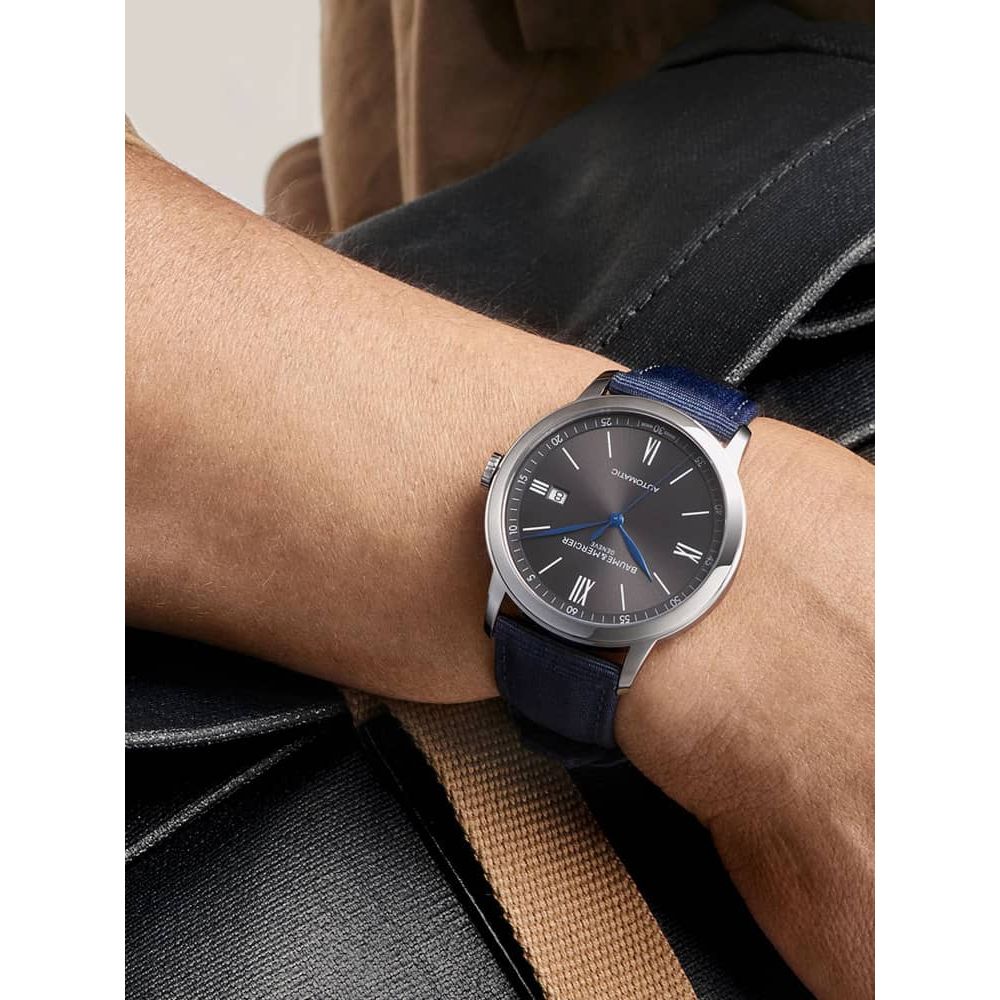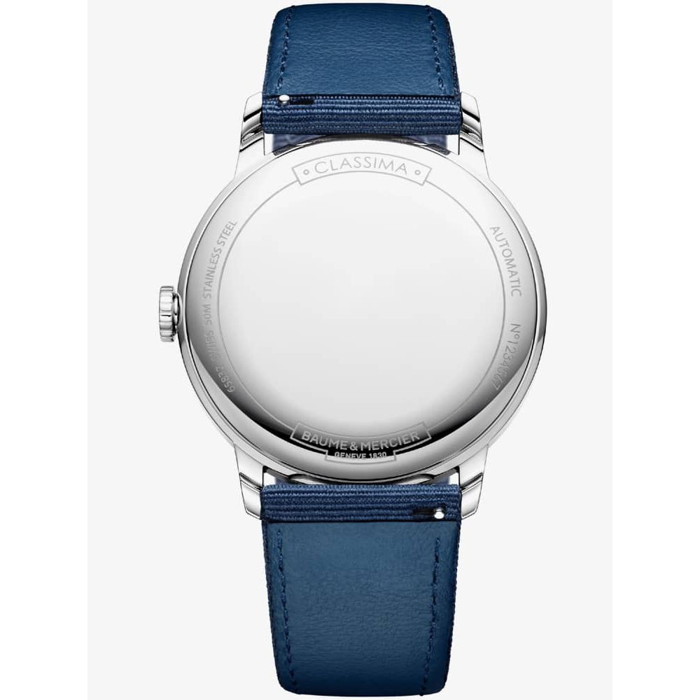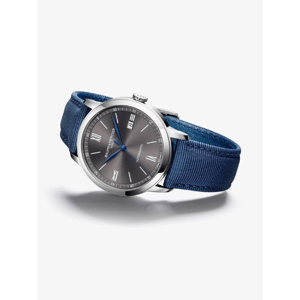 The Baume & Mercier 10608 Classima watch combines a 42mm round shaped stainless steel case and blue fabric strap with a traditional buckle. It has a slate grey analogue dial with a date display which is protected beneath scratch resistant sapphire crystal glass. Power is generated by the Swiss made Sellita SW200 automatic movement with 26 rubies and a power reserve of up to 38 hours. This model also has a water resistance of up to 50 metres.
