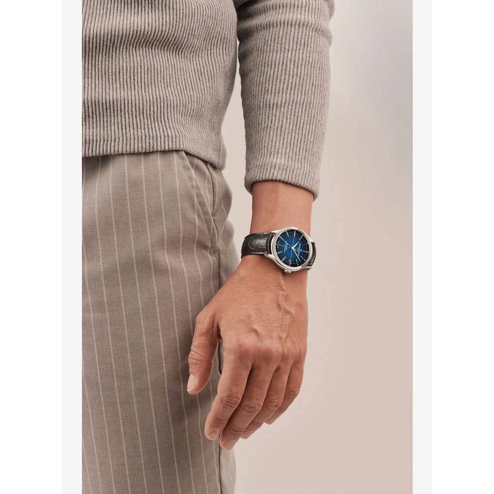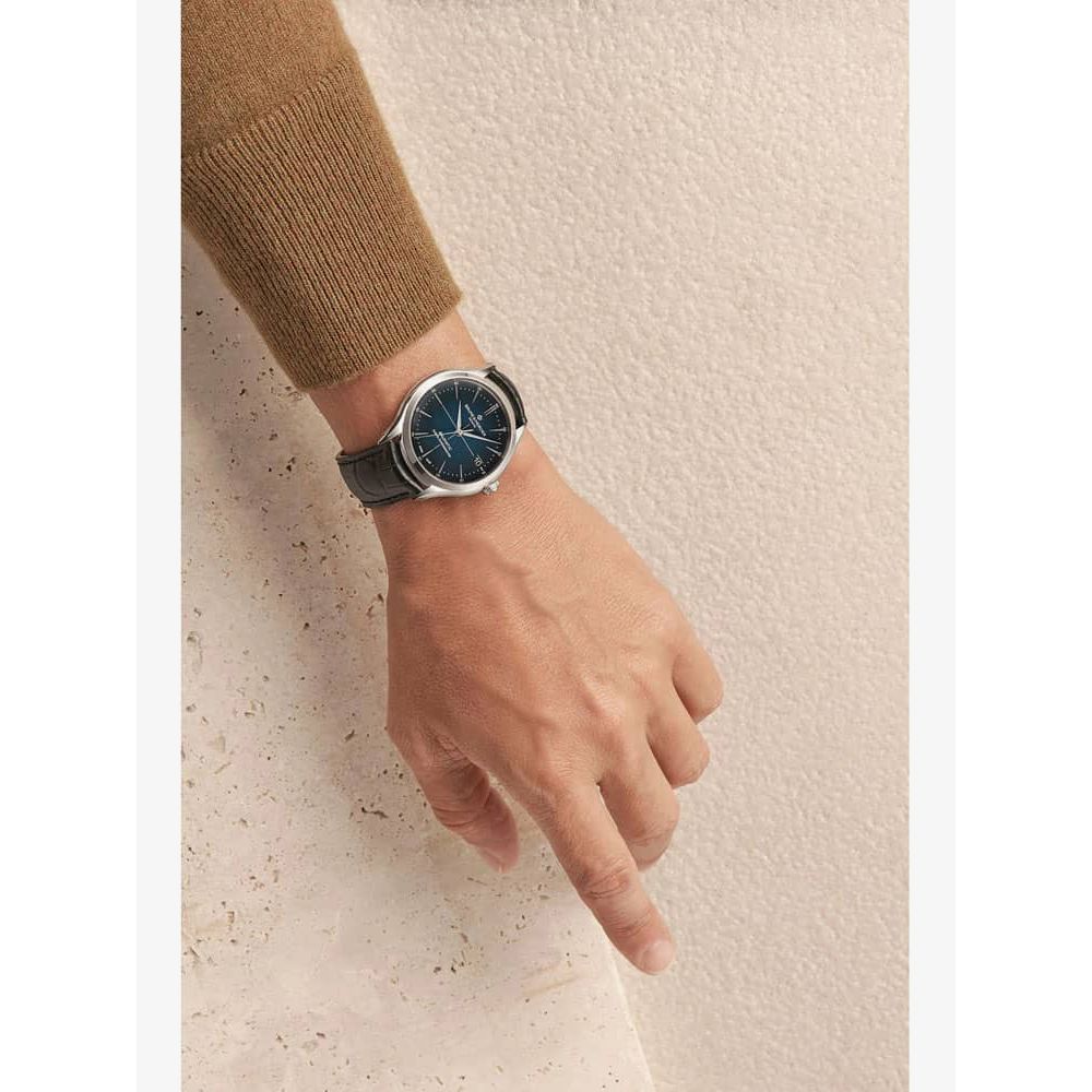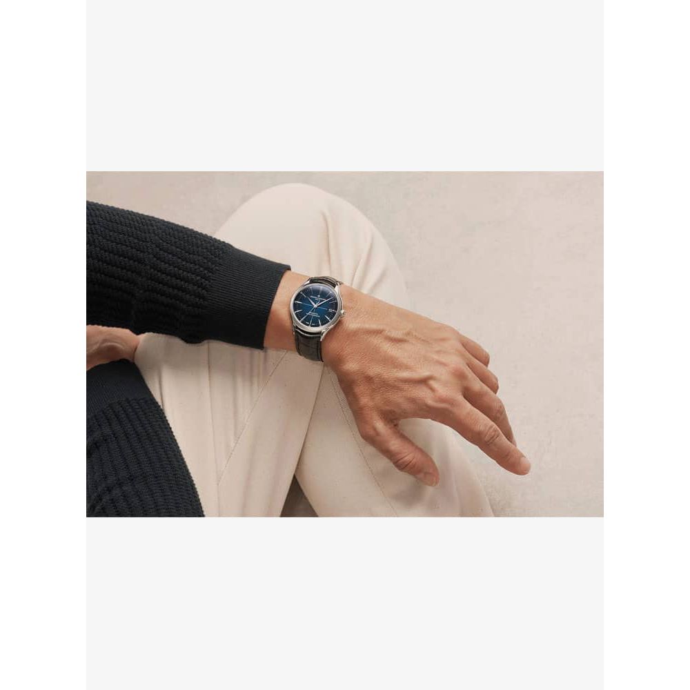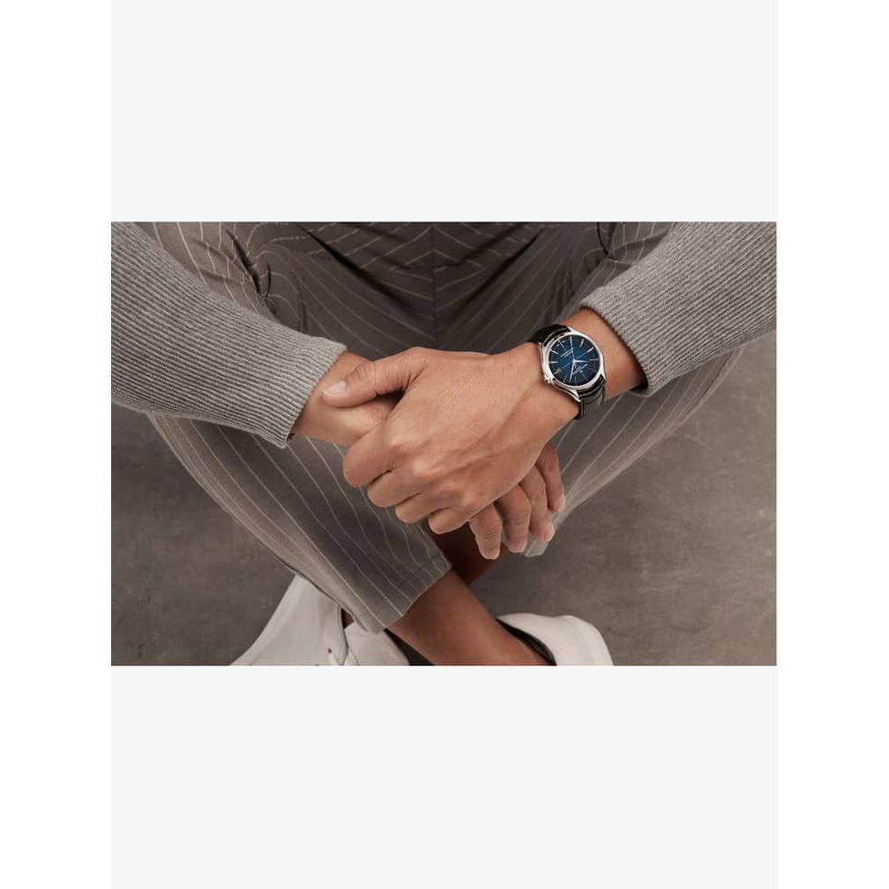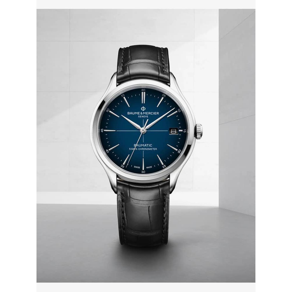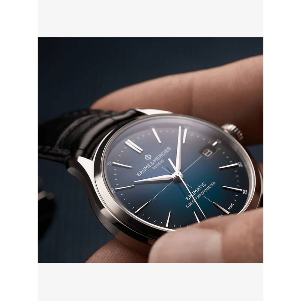 The Baume & Mercier 10467 Clifton watch combines a 40mm round shaped stainless steel case and black leather strap with a triple folding clasp and push button. It has a blue gradient fade effect analogue dial with a date display which is protected beneath scratch resistant sapphire crystal glass. Power is generated by the Swiss made Baumatic BM13-1975A automatic movement, a COSC certified movement with 21 rubies and a power reserve of up to 120 hours. This model also has a sapphire crystal case back and a water resistance of up to 50 metres.