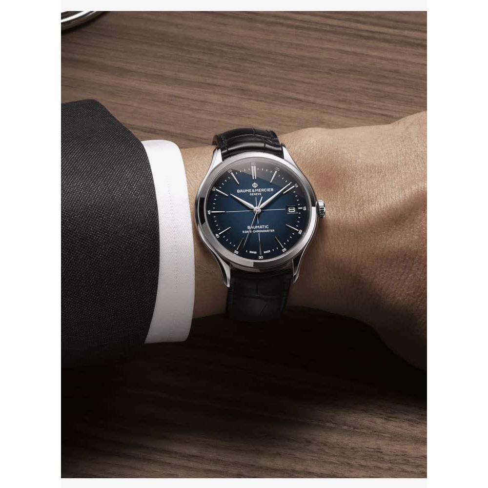 https://www.thbaker.co.uk/baume-mercier-mens-clifton-watch-10467103980Baume & Mercier Mens Clifton Watch 10467https://www.thbaker.co.uk/media/catalog/product/2/4/24-10-012_grey.jpg23923200GBPOutOfStockCLIFTON SS BLK SW BLU/BLK The Baume & Mercier 10467 Clifton watch combines a 40mm round shaped stainless steel case and black leather strap with a triple folding clasp and push button. It has a blue gradient fade effect analogue dial with a date display which is protected beneath scratch resistant sapphire crystal glass. Power is generated by the Swiss made Baumatic BM13-1975A automatic movement, a COSC certified movement with 21 rubies and a power reserve of up to 120 hours. This model also has a sapphire crystal case back and a water resistance of up to 50 metres.Baume & Mercierhttps://www.thbaker.co.uk/media/catalog/product/2/4/24-10-012_10_grey.jpghttps://www.thbaker.co.uk/media/catalog/product/2/4/24-10-012_05_grey.jpghttps://www.thbaker.co.uk/media/catalog/product/2/4/24-10-012_09_grey.jpghttps://www.thbaker.co.uk/media/catalog/product/2/4/24-10-012_04_grey.jpghttps://www.thbaker.co.uk/media/catalog/product/2/4/24-10-012_08_grey.jpghttps://www.thbaker.co.uk/media/catalog/product/2/4/24-10-012_03_grey.jpghttps://www.thbaker.co.uk/media/catalog/product/2/4/24-10-012_07_grey.jpghttps://www.thbaker.co.uk/media/catalog/product/2/4/24-10-012_02_grey.jpghttps://www.thbaker.co.uk/media/catalog/product/2/4/24-10-012_06_grey.jpghttps://www.thbaker.co.uk/media/catalog/product/b/a/baume-and-mercier-packaging_grey_1.jpg7613375144540add-to-cartcondition:Nodisc_no_stock:Yesex_display:NoNoYesNo2410012Baume & Mercier10467MensOfficial Baume & Mercier Packaging2 Year Baume & Mercier WarrantyLuxuryNoCliftonWatchBlackLeather StrapStainless SteelRound11.0mm40mmAnalogueSapphire Crystal GlassBlue50 metresAutomaticPush Button Deployment ClaspNo StoneNoNoNoYesYesNoNoBaume & Mercier Mens Clifton Watch24-10-0122021-04-21 00:00:00[]2021-04-21