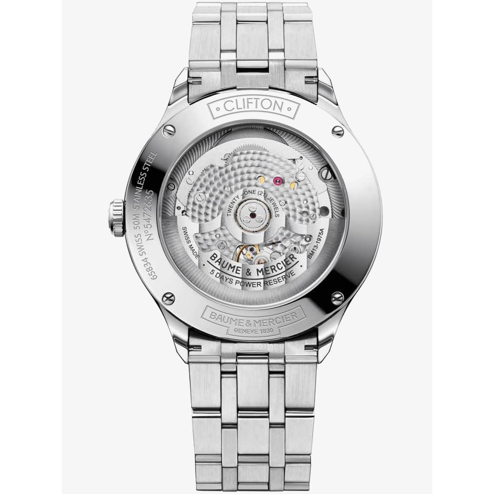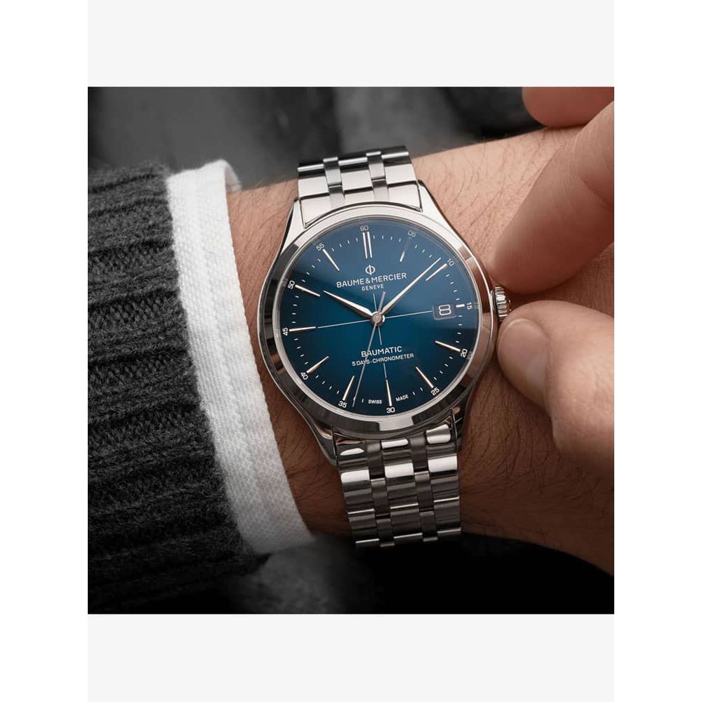 The Baume & Mercier 10467 Clifton watch combines a 40mm round shaped stainless steel case and bracelet with a triple folding clasp and push button. It has a blue gradient fade effect analogue dial with a date display which is protected beneath scratch resistant sapphire crystal glass. Power is generated by the Swiss made Baumatic BM13-1975A automatic movement, a COSC certified movement with 21 rubies and a power reserve of up to 120 hours. This model also has a sapphire crystal case back and a water resistance of up to 50 metres.