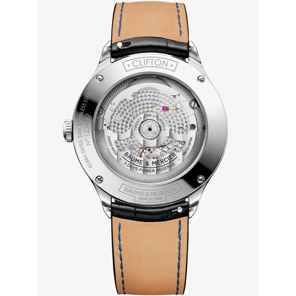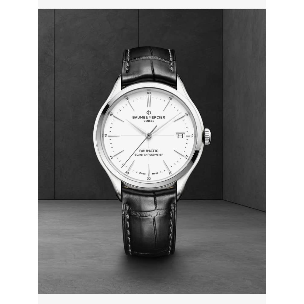 https://www.thbaker.co.uk/baume-mercier-mens-clifton-watch-10518103984Baume & Mercier Mens Clifton Watch 10518https://www.thbaker.co.uk/media/catalog/product/2/4/24-10-016_grey.jpg16003200GBPOutOfStockCLIFTON SS BLK SW WHT DL The Baume & Mercier 10518 Clifton watch combines a 40mm round shaped stainless steel case and black leather strap with a triple folding clasp and push button. It has a white analogue dial with a date display which is protected beneath scratch resistant sapphire crystal glass. Power is generated by the Swiss made automatic movement with a 120 hour power reserve. This model also has a sapphire crystal case back and a water resistance of up to 50 metres.Baume & Mercierhttps://www.thbaker.co.uk/media/catalog/product/2/4/24-10-016_05_grey.jpghttps://www.thbaker.co.uk/media/catalog/product/2/4/24-10-016_04_grey.jpghttps://www.thbaker.co.uk/media/catalog/product/2/4/24-10-016_03_grey.jpghttps://www.thbaker.co.uk/media/catalog/product/2/4/24-10-016_02_grey.jpghttps://www.thbaker.co.uk/media/catalog/product/2/4/24-10-016_06_grey.jpghttps://www.thbaker.co.uk/media/catalog/product/b/a/baume-and-mercier-packaging_grey_1.jpg7613375294757add-to-cartcondition:Nodisc_no_stock:Yesex_display:NoNoYesNo2410016Baume & Mercier10518MensOfficial Baume & Mercier Packaging2 Year Baume & Mercier WarrantyLuxuryNoCliftonWatchBlackLeather StrapStainless SteelRound11.0mm40mmAnalogueSapphire Crystal GlassWhite50 metresAutomaticPush Button Deployment ClaspNo StoneNoNoNoNoYesNoNoBaume & Mercier Mens Clifton Watch24-10-0162021-04-21 00:00:00[]2021-04-21