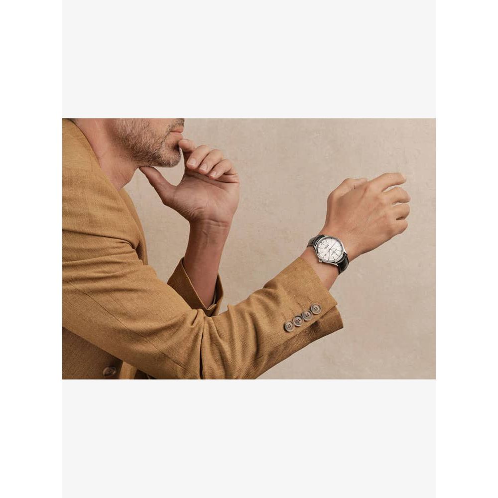 The Baume & Mercier 10518 Clifton watch combines a 40mm round shaped stainless steel case and black leather strap with a triple folding clasp and push button. It has a white analogue dial with a date display which is protected beneath scratch resistant sapphire crystal glass. Power is generated by the Swiss made automatic movement with a 120 hour power reserve. This model also has a sapphire crystal case back and a water resistance of up to 50 metres.