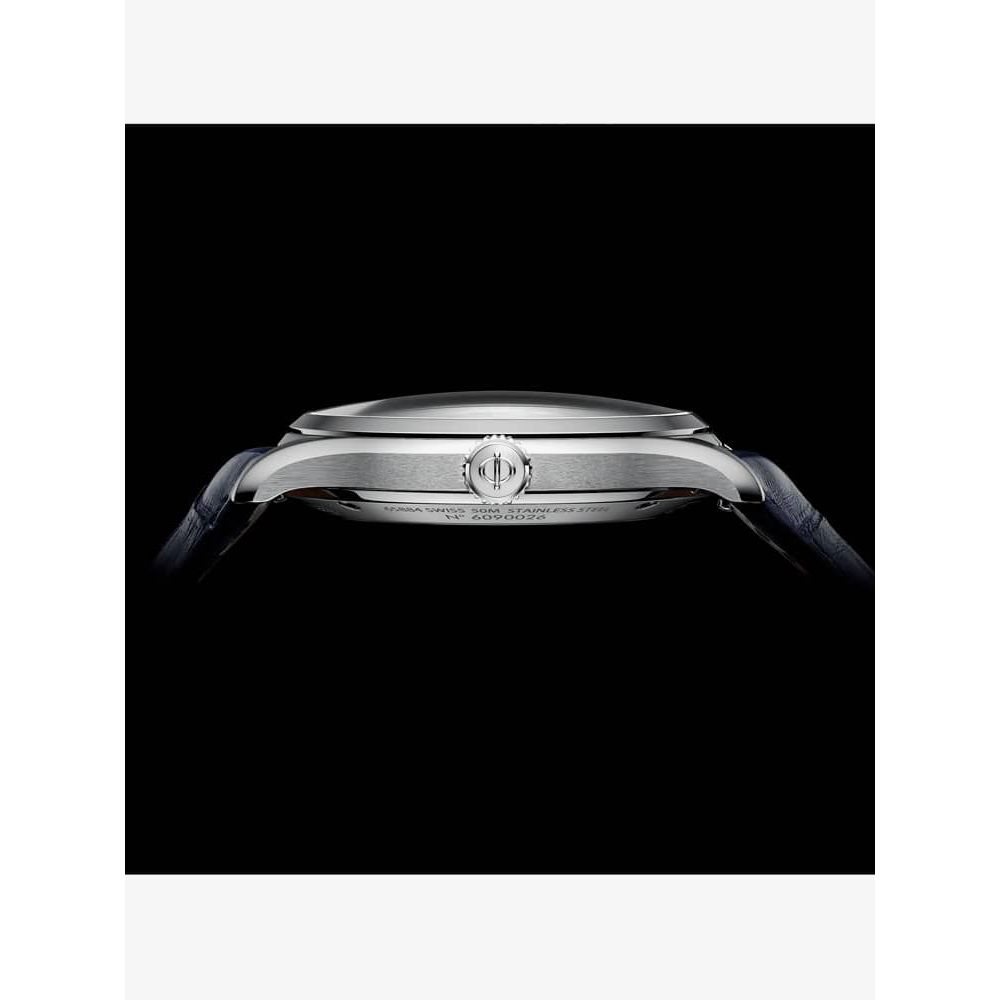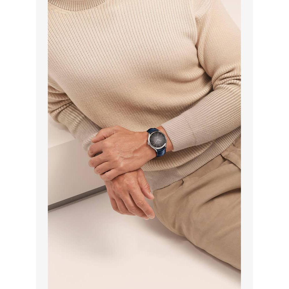 The Baume & Mercier 10550 Clifton watch combines a 40mm round shaped stainless steel case and blue leather strap with a triple folding clasp and push button. It has a grey fade effect analogue dial with a date display which is protected beneath scratch resistant sapphire crystal glass. Power is generated by the Swiss made COSC certified Baumatic BM13-1975A automatic movement with 21 rubies and a power reserve of up to 120 hours. This model also has a sapphire crystal case back and a water resistance of up to 50 metres.