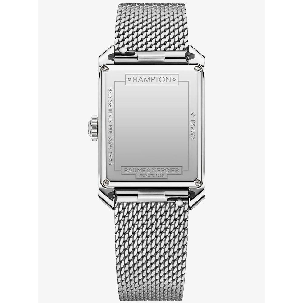 Baume & Mercier 10671 Hampton watch combines a 43mm rectangle-shaped stainless steel case and silver interchangeable Milanese stainless steel mesh bracelet with a push-button deployment clasp. It has a blue sun satin-brushed analogue dial with rhodium-plated riveted numbers and indexes, which is protected beneath domed scratch-resistant sapphire crystal glass. Power is generated by the Swiss quartz movement. This model also has a water resistance of up to 50 metres.Baume & Mercierhttps://www.thbaker.co.uk/media/catalog/product/2/4/24-09-045_baumemercier_02.jpghttps://www.thbaker.co.uk/media/catalog/product/2/4/24-09-045_baumemercier_03.jpghttps://www.thbaker.co.uk/media/catalog/product/2/4/24-09-045_baumemercier_04.jpghttps://www.thbaker.co.uk/media/catalog/product/2/4/24-09-045_baumemercier_05.jpghttps://www.thbaker.co.uk/media/catalog/product/2/4/24-09-045_baumemercier_06.jpghttps://www.thbaker.co.uk/media/catalog/product/b/a/baume-and-mercier-packaging_4.jpeg7613375707165condition:Nodisc_no_stock:Yesex_display:NoNoYesNo2409045Baume & Mercier10671MensOfficial Baume & Mercier Packaging2 Year Baume & Mercier WarrantyClassicNoWatchSilverStainless Steel BraceletStainless SteelRectangle9.0mm43mmAnalogueSapphire Crystal GlassBlue50 metresQuartzPush Button Deployment ClaspNo StoneNoNoNoNoNoNoNoEx-Display Baume & Mercier Mens Hampton Mesh Watch24-09-0452022-06-24 00:00:000[]2022-06-24