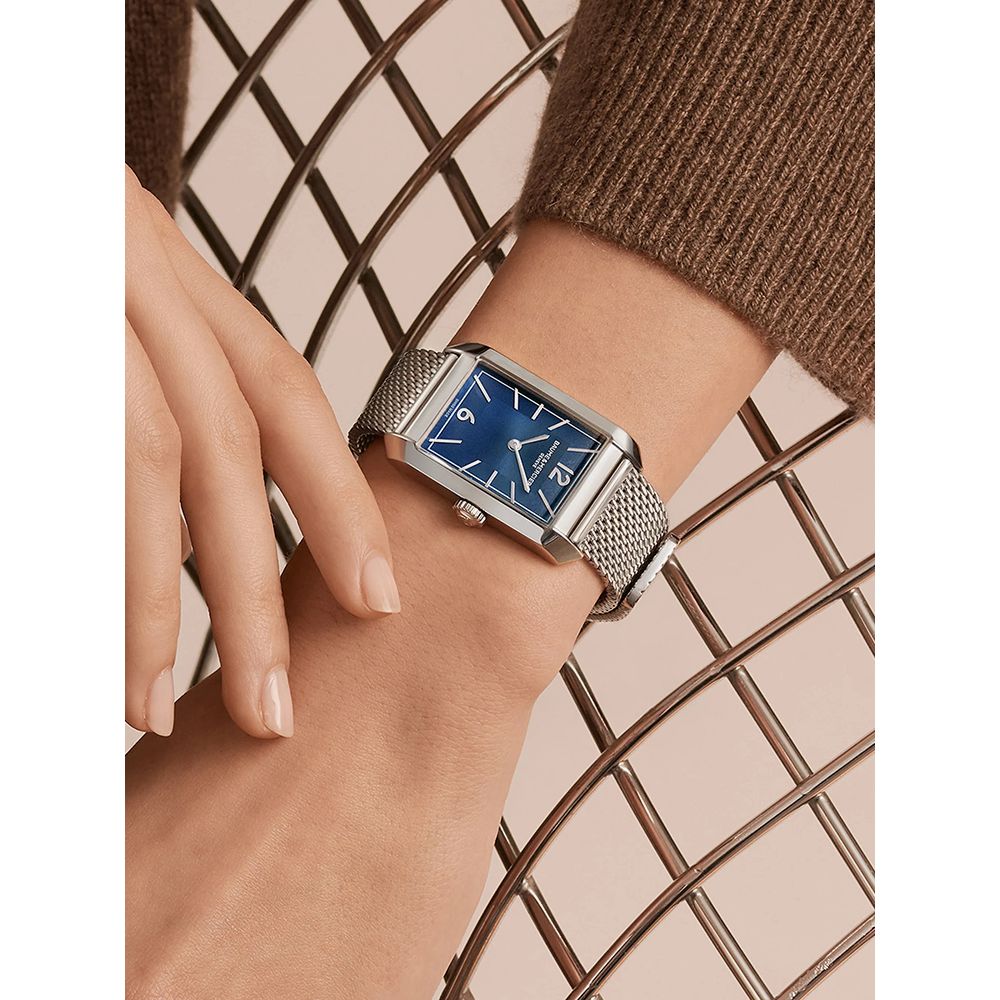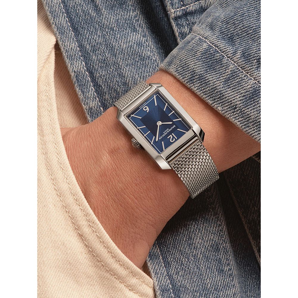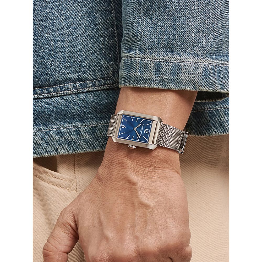 Baume & Mercier 10671 Hampton watch combines a 43mm rectangle-shaped stainless steel case and silver interchangeable Milanese stainless steel mesh bracelet with a push-button deployment clasp. It has a blue sun satin-brushed analogue dial with rhodium-plated riveted numbers and indexes, which is protected beneath domed scratch-resistant sapphire crystal glass. Power is generated by the Swiss quartz movement. This model also has a water resistance of up to 50 metres.