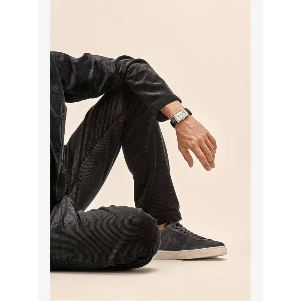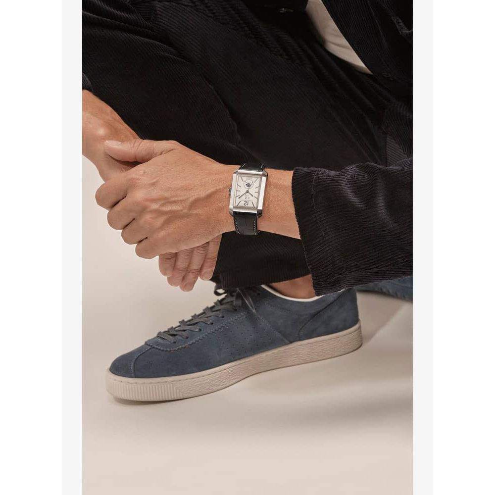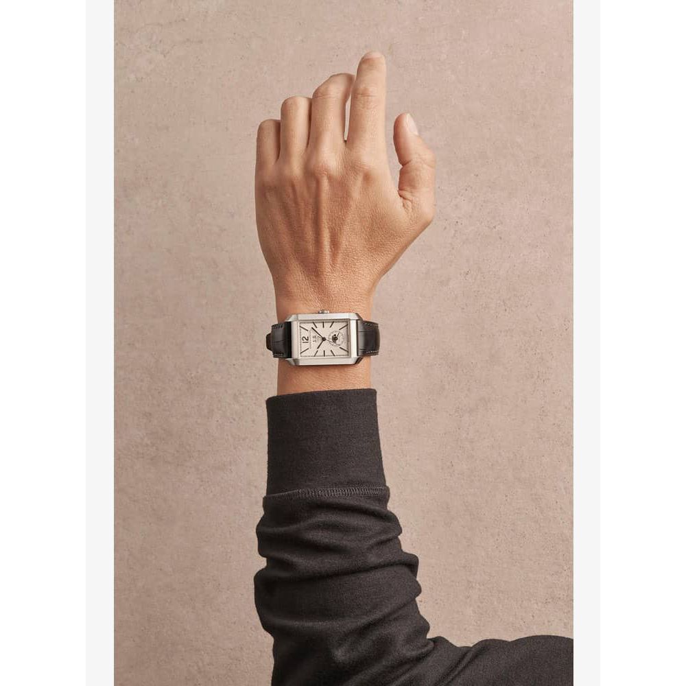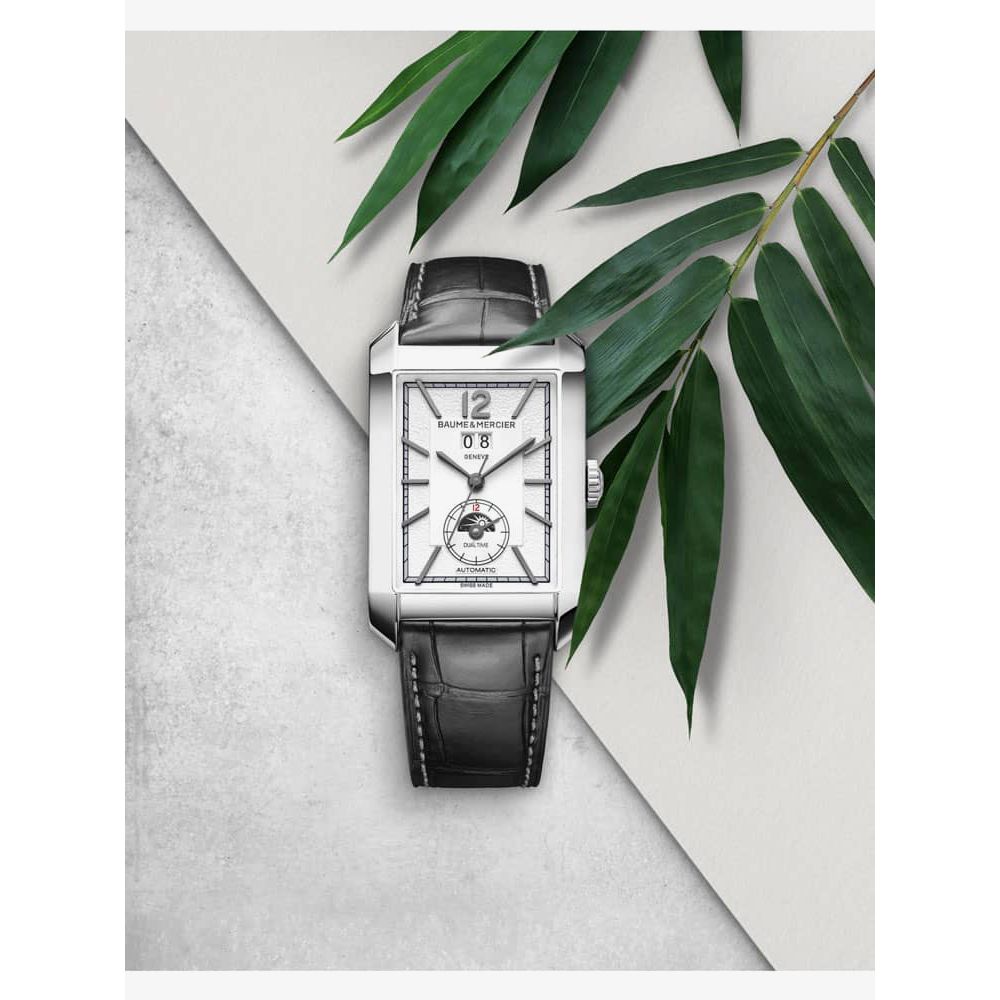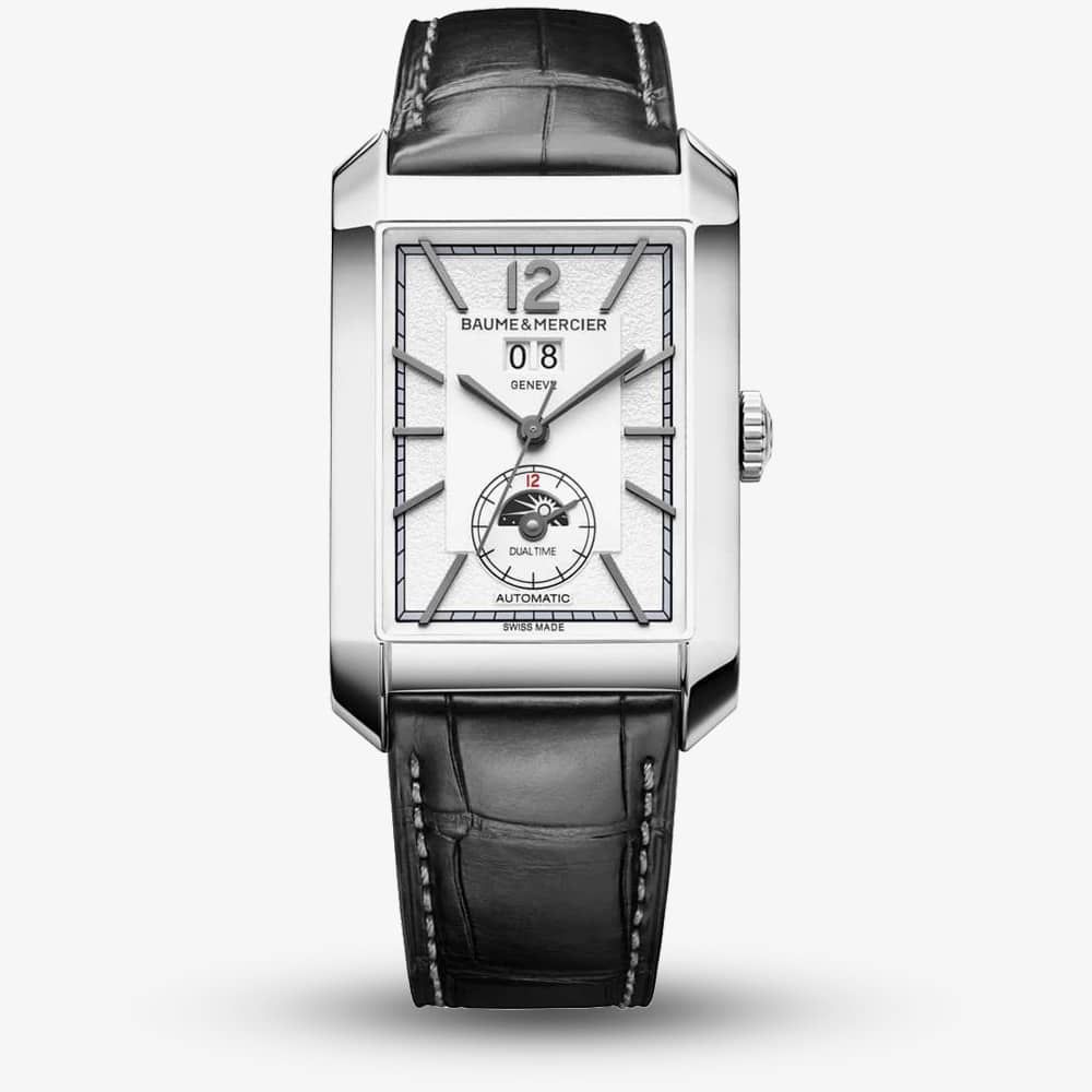 The Baume & Mercier 10523 Hampton watch combines a rectangular shaped stainless steel case and black leather strap with a triple folding clasp and push button. The case measures 31mm wide by 48mm long. It has a silver analogue dial with a date display and dual time sub-dial which is protected beneath scratch resistant sapphire crystal glass. Power is generated by the Swiss made Soprod TT651 automatic movement with 21 rubies and a power reserve of up to 42 hours. This model also has a sapphire crystal case back and a water resistance of up to 50 metres.