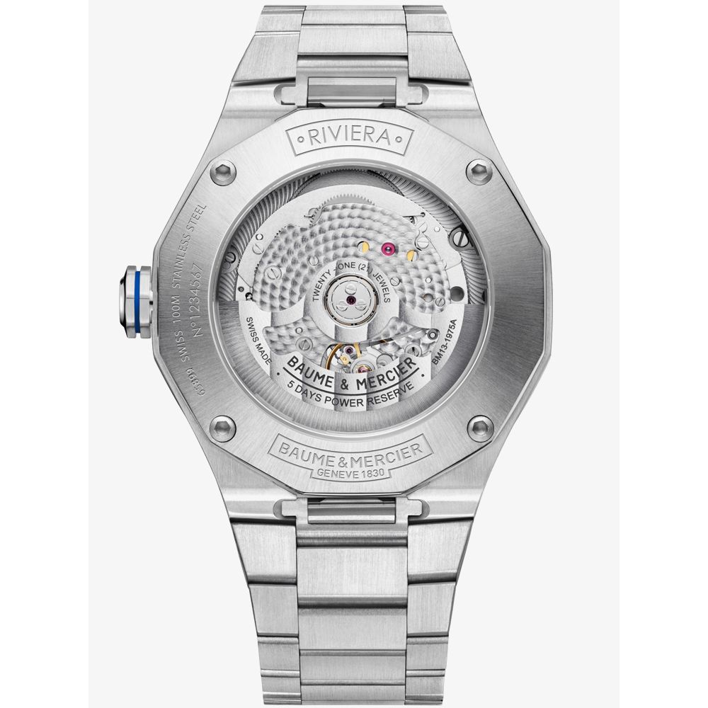 Watches and Wonders The Baume & Mercier 10616 watch combines a 42mm round shaped stainless-steel case and silver stainless steel bracelet with a push button deployment clasp. It has a blue analogue dial with luminescent hands, date display which is protected beneath scratch resistant sapphire crystal glass. Power is generated by the automatic movement which has a power reserve of 120 hours. This model also has a water resistance of up to 100 metres.Baume & Mercierhttps://www.thbaker.co.uk/media/catalog/product/2/4/24-10-083_04.jpghttps://www.thbaker.co.uk/media/catalog/product/2/4/24-10-083_02.jpghttps://www.thbaker.co.uk/media/catalog/product/2/4/24-10-083_03.jpg7613375590330condition:Nodisc_no_stock:Yesex_display:Nosearch_keywords:waterproofNoYesNowaterproof2410083Baume & Mercier10616MensOfficial Baume & Mercier Packaging2 Year Baume & Mercier WarrantyClassicNoWatchSilverStainless Steel BraceletStainless SteelRound10.0mm42mmAnalogueSapphire Crystal GlassBlue100 metresAutomaticPush Button Deployment ClaspNoNoNoNoYesYesNoBaume & Mercier Mens Riviera Blue DIal Watch24-10-0832022-10-03 00:00:00[]2022-10-03