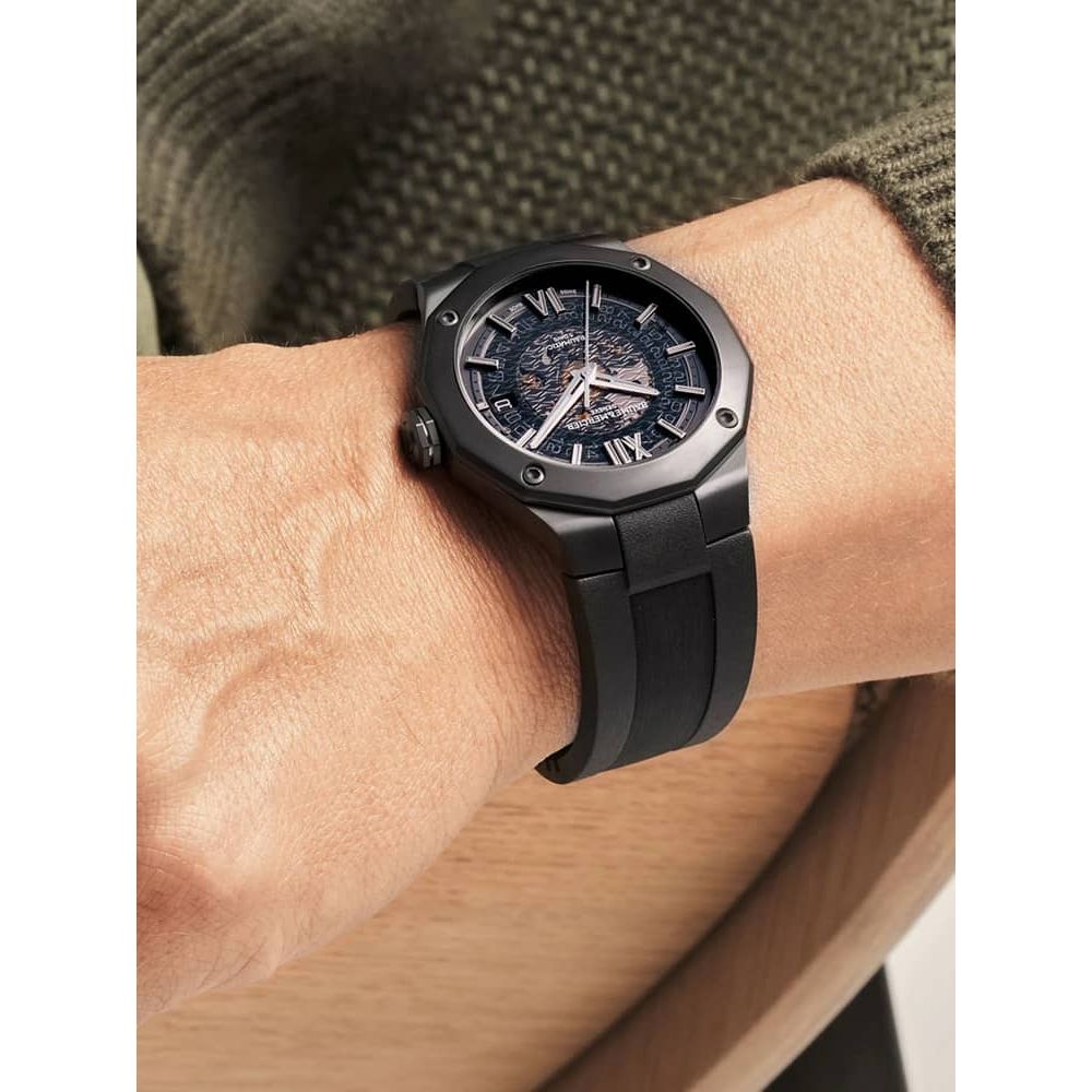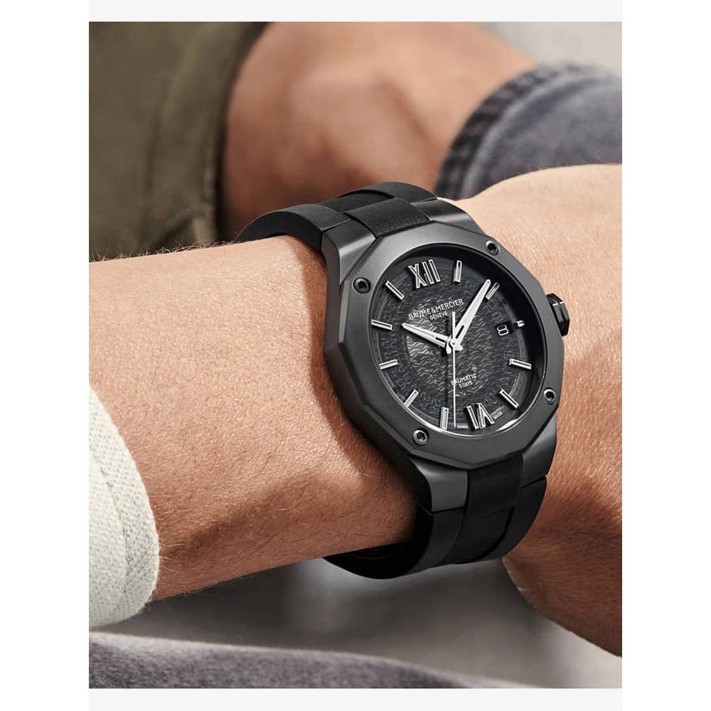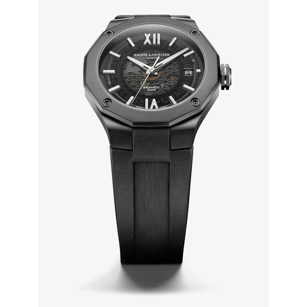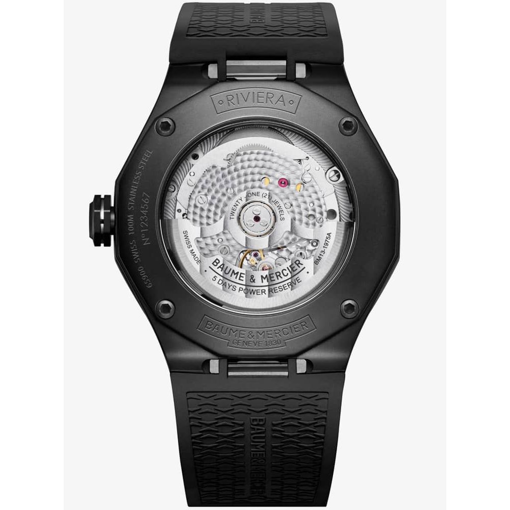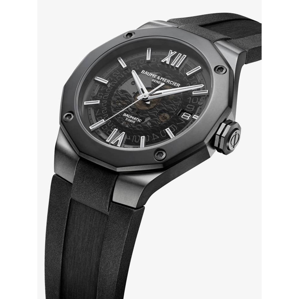 The Baume & Mercier 10617 Riviera watch combines a 42mm round shaped black stainless steel case and dodecagonal bezel with a black rubber strap and push button clasp. It has a skeleton analogue dial with luminescent hands and a date display which is protected beneath scratch resistant sapphire crystal glass with an anti-glare coating. Power is generated by the Swiss made Baumatic BM13-1975A COSC certified automatic chronometer movement with 21 rubies and a power reserve of up to 120 hours. This model also has a sapphire crystal case back and a water resistance of up to 100 metres.