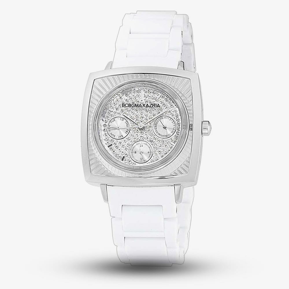 BCBG Maxazria bring us this stunning silver square bezel watch with its elegant stone set dial hosting a trio of sub dials displaying the date and 24 hour time. With a durable white rubber strap this watch is idea for every day wear.