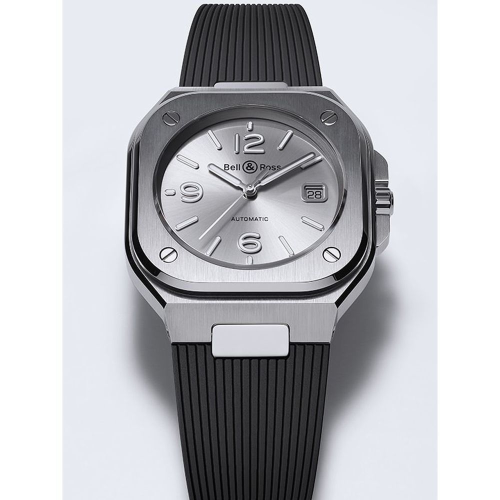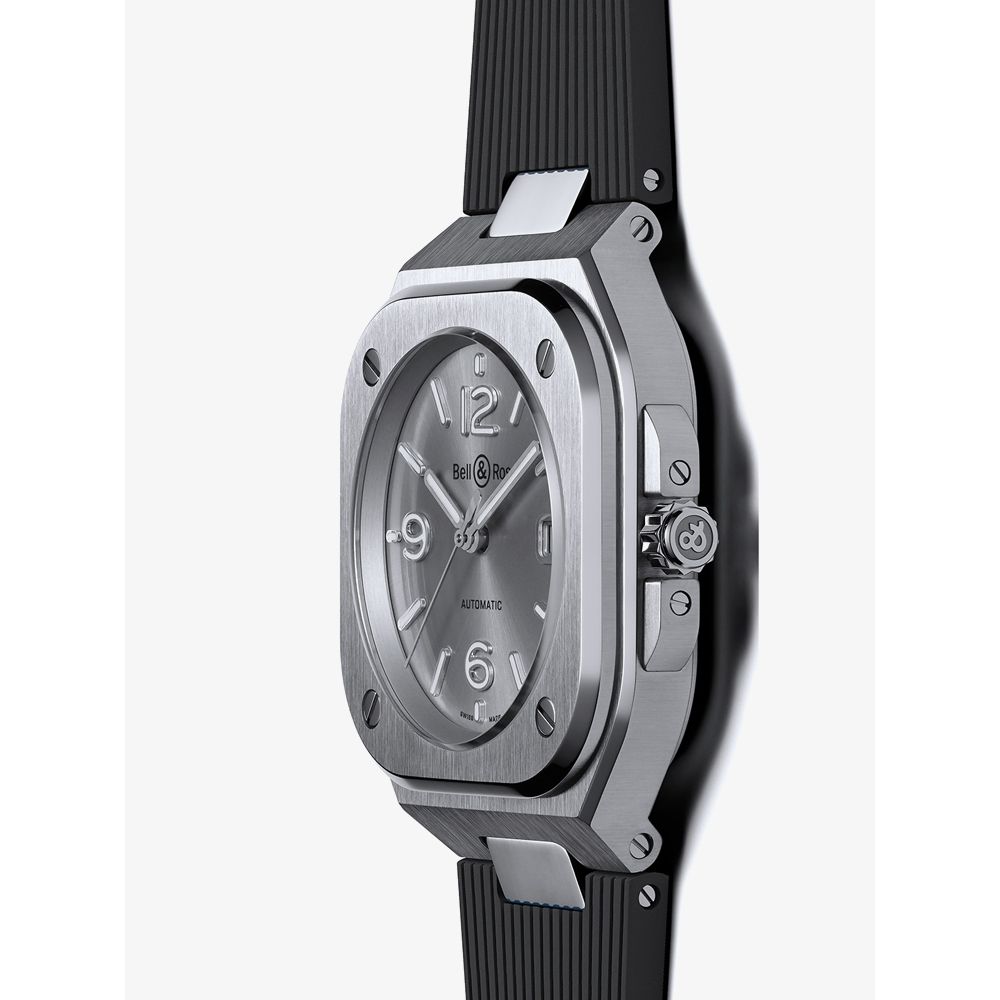 This Bell & Ross watch combines a 40mm square shaped satin-polished steel case. It has a grey analogue dial with silver tone Super-LumiNova filled hands and hour markers and a date window at the 3 o'clock position. The dial is protected beneath sapphire crystal glass with an anti-reflective coating. Power is generated by an automatic movement. This model has a water resistance of up to 100 metres and has been finished with a black rubber strap with a stain-polished steel traditional buckle fastening.
